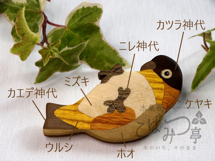 着色はせずに天然の木の色や木目を活かした「いきものブローチ」。自然な色の組み合わせがやさしい色合いを醸し出します。