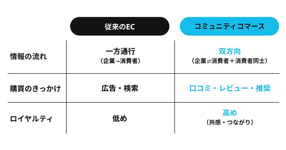 コミュニティコマースとは、企業やブランドのコミュニティと販売をシームレスにつなげる仕組みです。単なるECサイトとは異なり、顧客同士の交流やレビュー、推奨などのコミュニケーションが購買行動に影響を与えるのが特徴です。