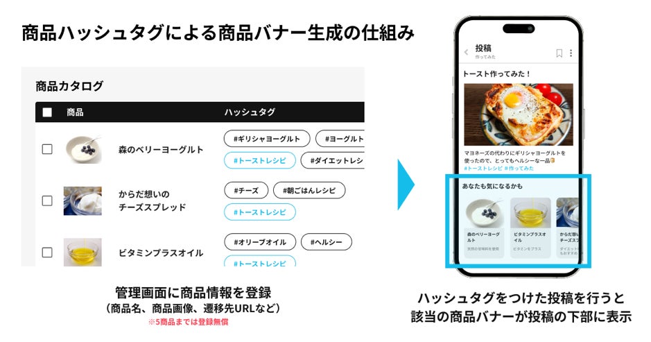 Communeを導入したコミュニティ内では、ハッシュタグをつけて投稿するとスレッド内に関連リンクが生成され、投稿を見たユーザーがスムーズに商品購入を行うことができます。これにより、購買への導線が自然に形成され、より直感的でストレスのない購入体験を提供します。