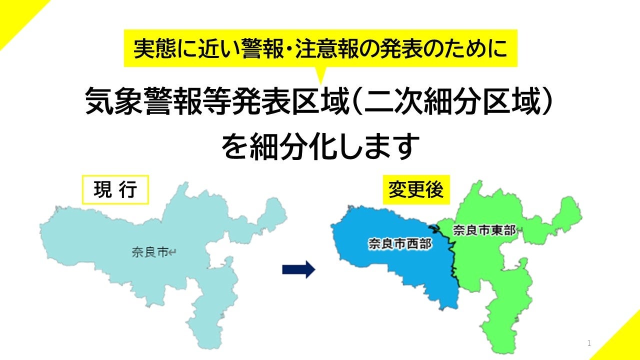 こうしたことから、令和2年度に奈良地方気象台へ、令和3年度に気象庁へ要望書を提出し、調整を続けておりましたが、このたび、二次細分区域が、「奈良市」から「奈良市西部・奈良市東部」に変更されることが決定されました。