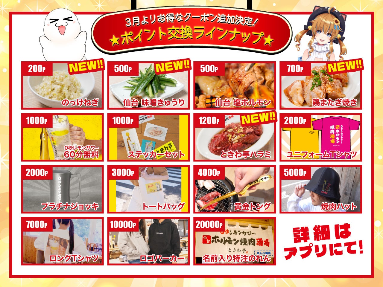 また、本キャンペーンにあわせて3月からポイントと交換できるメニューを拡充します。焼肉やタレにといろいろ美味しくなる万能トッピング「のっけねぎ(200P)」、「仙台味噌きゅうり(500P)」、隠れた人気メニュー「鶏またぎ焼き(700P)」、程よい弾力とクセのない味わいで大人気の「ときわ亭ハラミ(1,200P)」を新たに導入します。