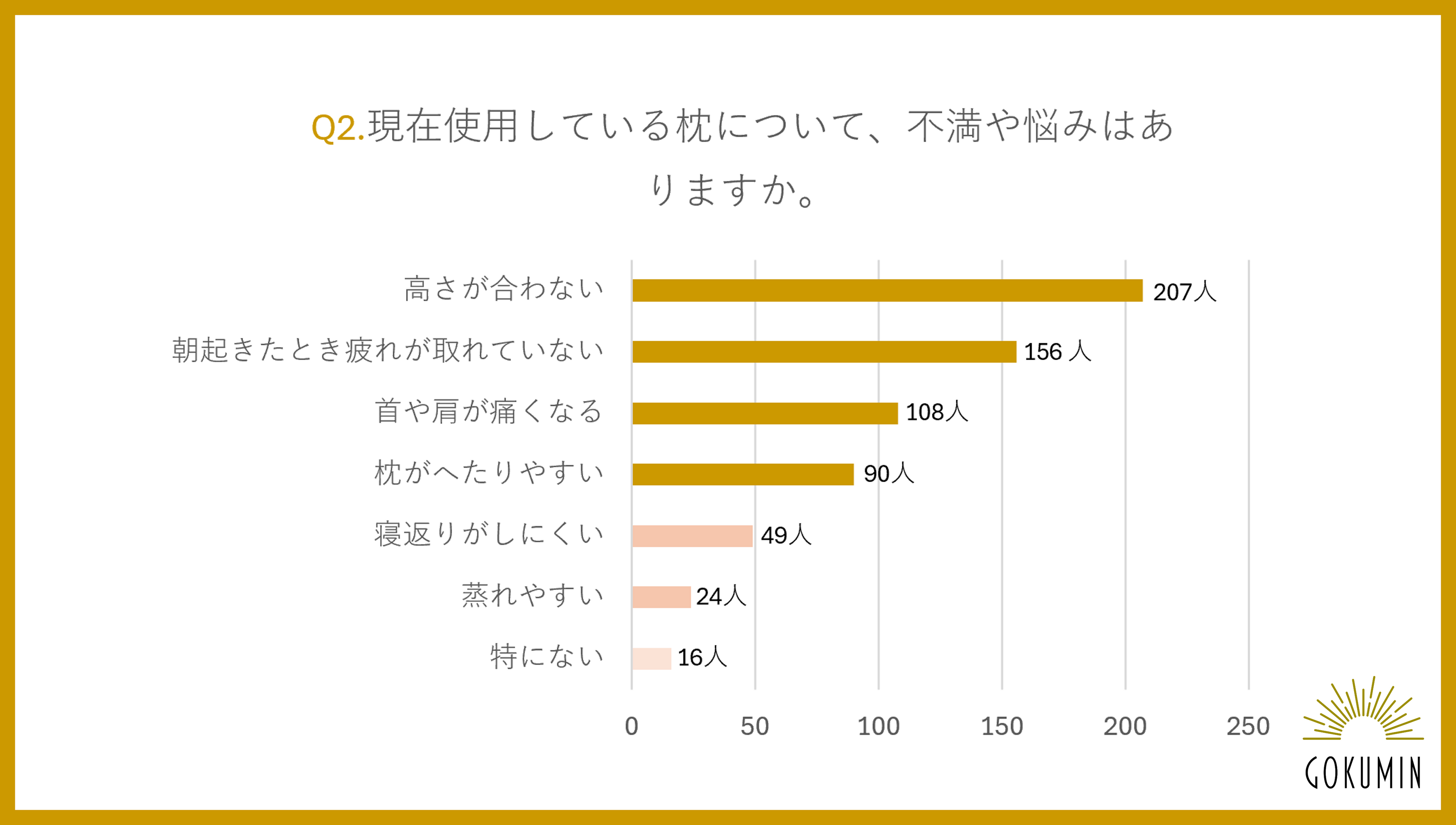 不満・悩みの内容では、「高さが合わない」が207人でトップとなりました。続いて「朝起きたとき疲れが取れていない」156人、「首や肩が痛くなる」108人、「枕がへたりやすい」90人、「寝返りがしにくい」49人と続き、高さ・フィット感・耐久性に関する課題が上位を占める結果となりました。