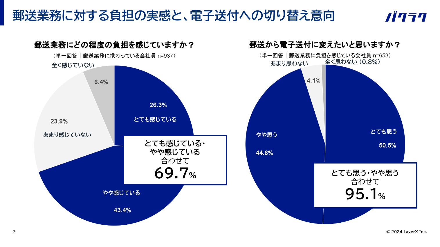 2. 69.7%が郵送業務に負担を感じていると回答。うち、95.1%が「郵送から電子送付に変えたい」と回答