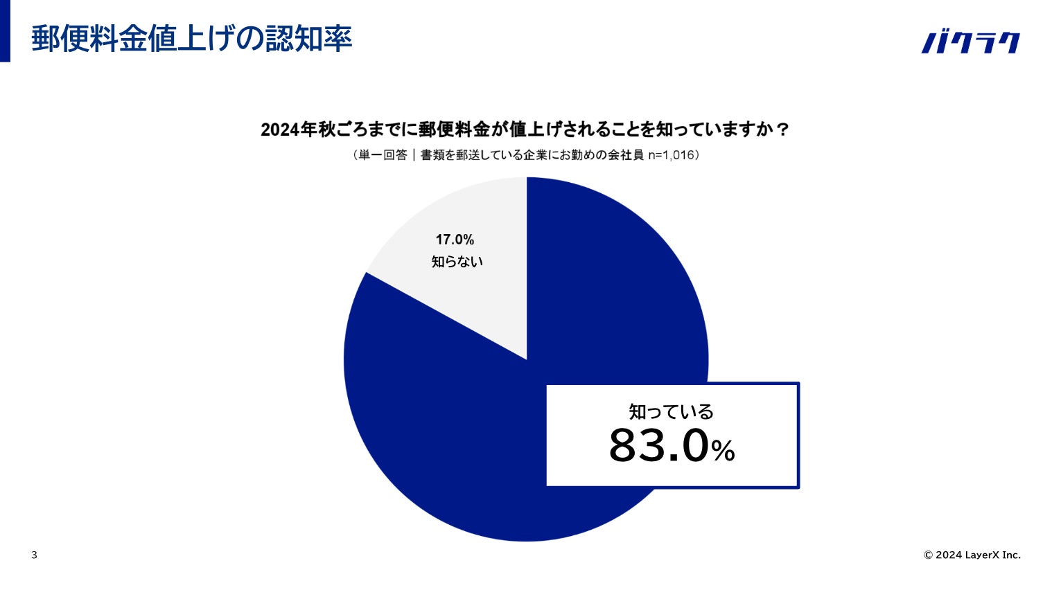 3. 83.0%が2024年秋ごろと言われている郵便料金の値上げを「知っている」と回答