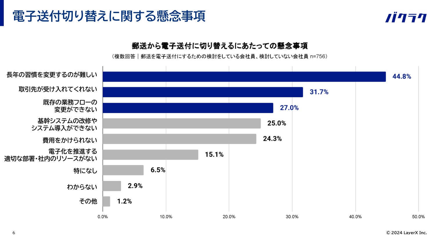 6. 電子送付切り替えに関する懸念事項TOP3は、1位「長年の習慣を変更するのが難しい」、2位「取引先が受け入れてくれない」、3位「既存の業務フローの変更ができない」