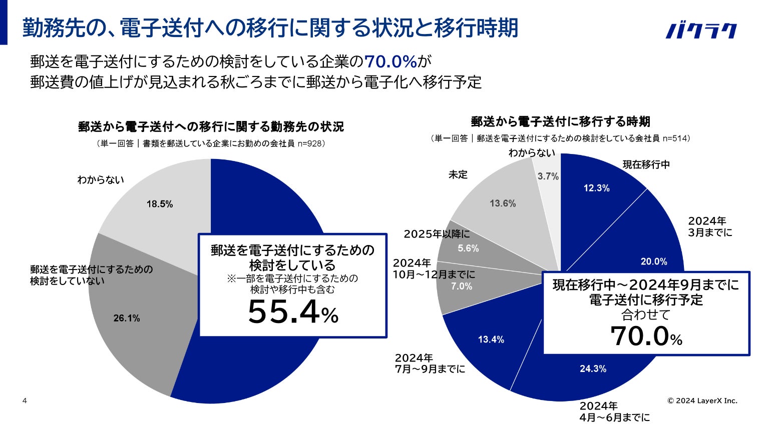 4. 55.4%の企業が、郵送から電子送付を検討・移行中。うち、70.0%の企業は2024年9月までに電子送付化が完了予定