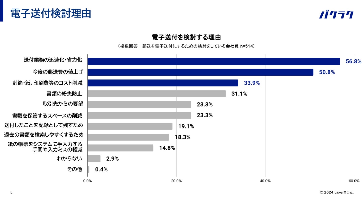 5. 電子送付を検討している企業の検討理由TOP3は、1位「送付業務の迅速化・省力化」、2位「今後の郵送費の値上げ」、3位「封筒・紙、印刷費等のコスト削減」