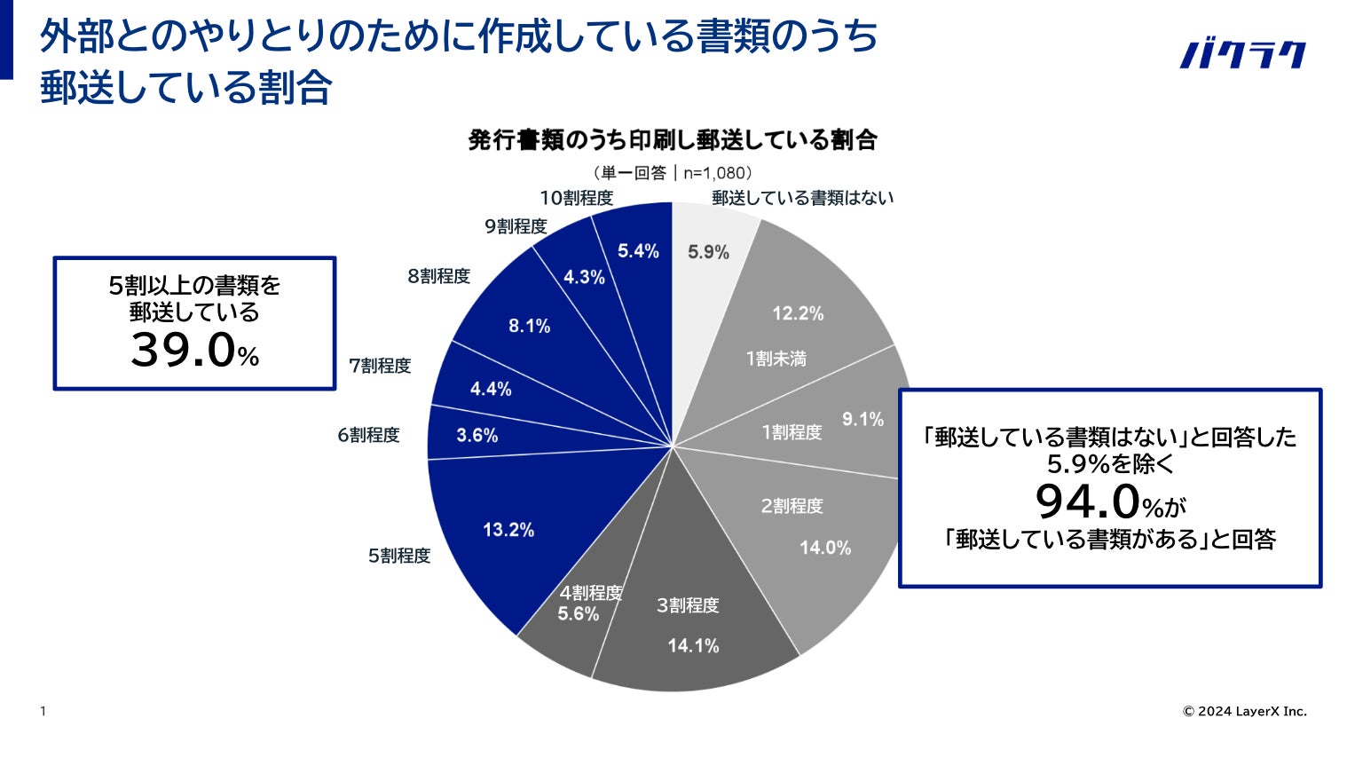1. 外部とのやり取りのために作成している書類(見積書、請求書、納品書など)を印刷し郵送している企業は94.0%。全書類のうち5割以上を郵送していると回答した企業は39.0%