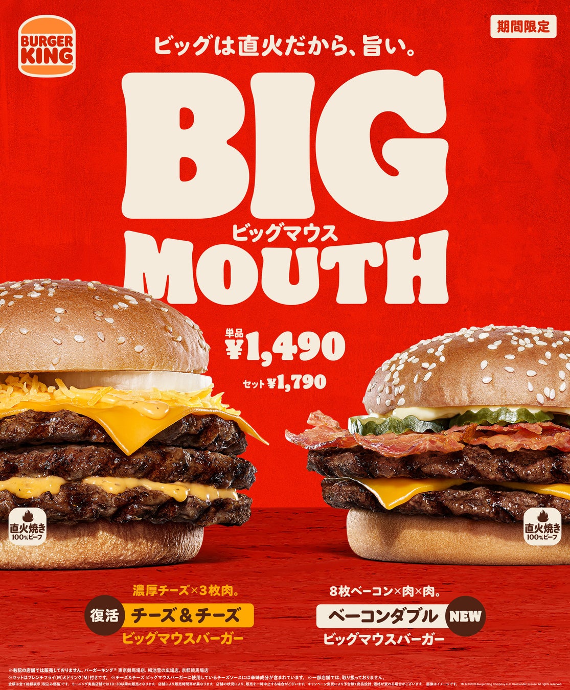 バーガーキング® の直火焼きだから旨い、炎で焼いた香ばしい100%ビーフパティから肉の旨味が溢れ出す「ビッグマウス」シリーズから、直火焼きのトリプルビーフに濃厚チーズのシリーズ売り上げNo.1商品『チーズ&チーズ ビッグマウスバーガー』が期間限定で復活。直火焼きビーフ2枚にスモーキーなベーコン8枚が本格的なおいしさの新商品『ベーコンダブル ビッグマウスバーガー』が期間限定で新登場いたします。