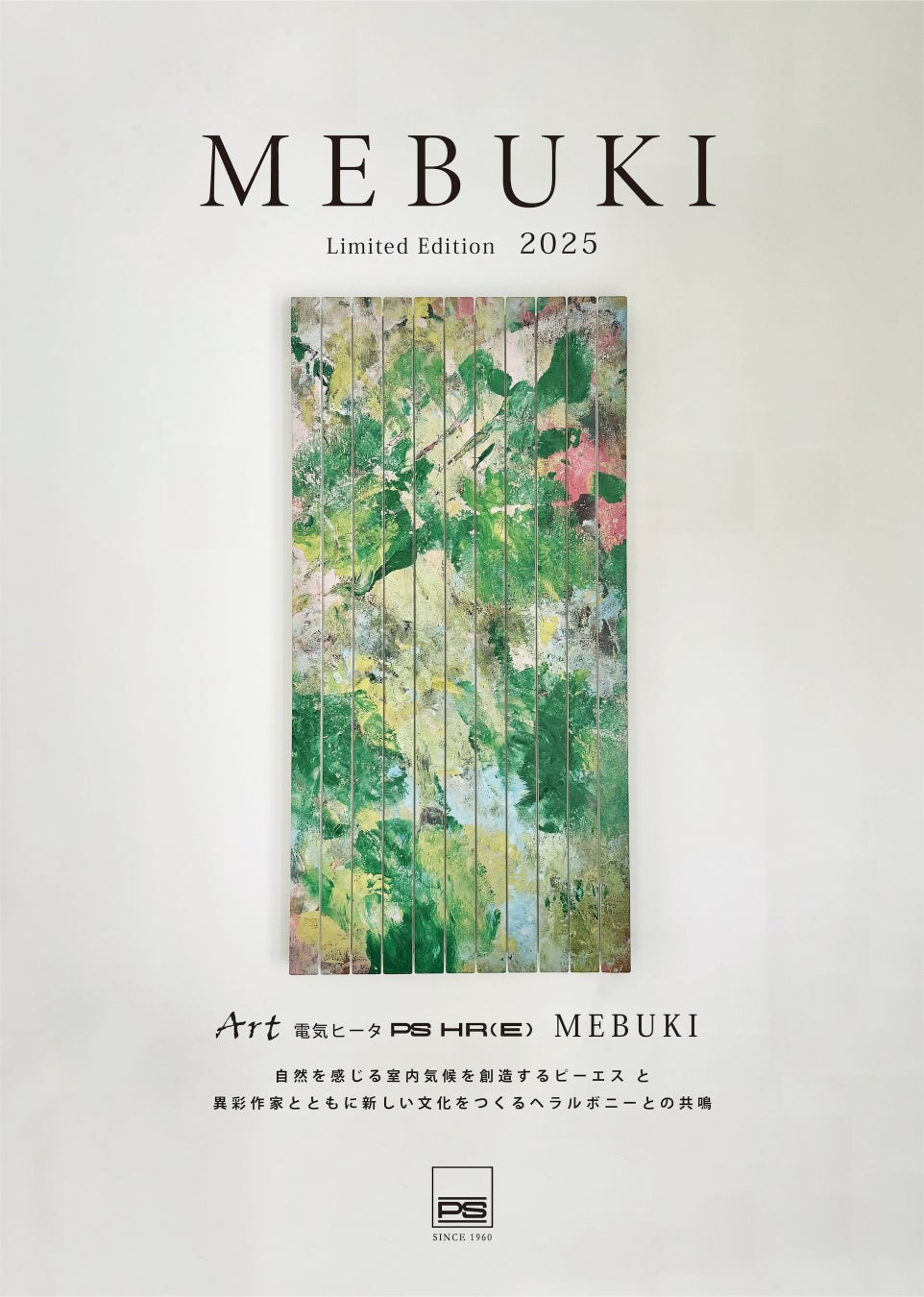 岩手県八幡平市に工場を構えるピーエスは、同じく岩手に本社を置くヘラルボニーと、ヘラルボニー契約作家の強いエネルギーを持つアート作品の素晴らしさに感銘を受け、共創を開始いたしました。そして、ピーエスの創立65年に合わせ「MEBUKI」が誕生しました。ピーエスのヒータは、その高い機能性から住宅からクリニックなどの公共施設まで幅広く使用されており、特に冬が厳しい北国を中心に長年にわたって実績を積み上げています。