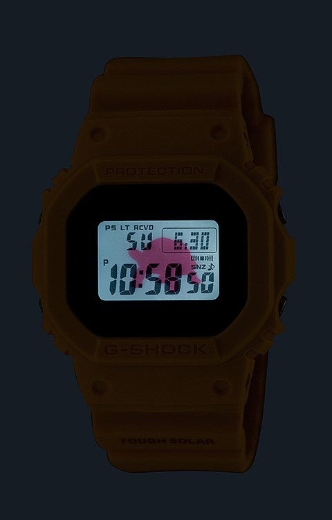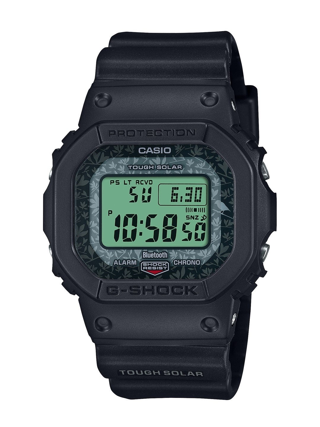 今回ご案内します『GW-B5600CD』は、ガラパゴス諸島に生息する生物のシルエットとその生息地である豊かな自然をテーマにデザインをした耐衝撃ウオッチです。電波受信機能とタフソーラーを搭載した「GW-B5600」をベースモデルに採用しながら、原料に再生可能な有機性資源を含むバイオマスプラスチックを、ベゼルやバンドに採用しています。