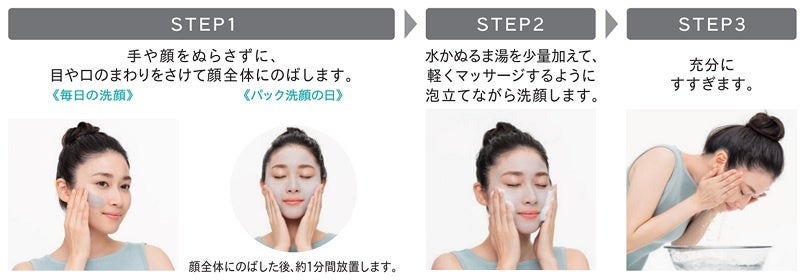 週1~2回、手や顔をぬらさずに、3㎝位の量を目や口の周りをさけて少量ずつ顔全体に伸ばす。約1分後、水かぬるま湯を加えながら泡立てて洗顔し、充分にすすぐ。