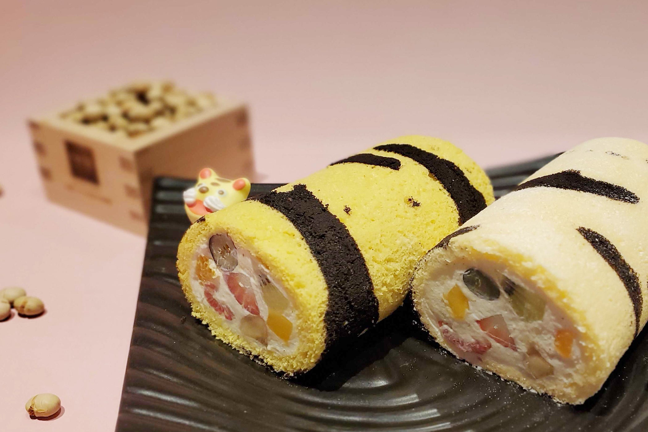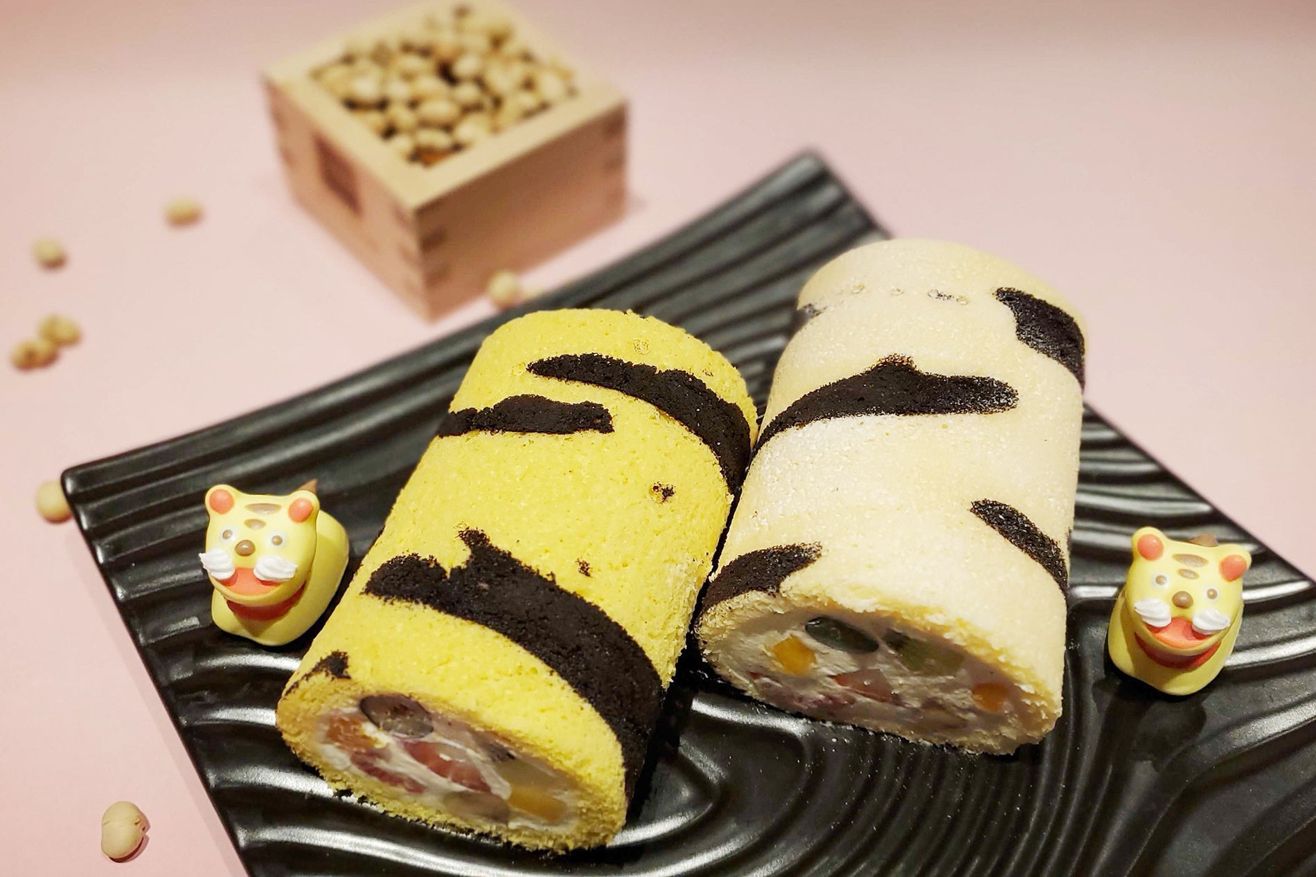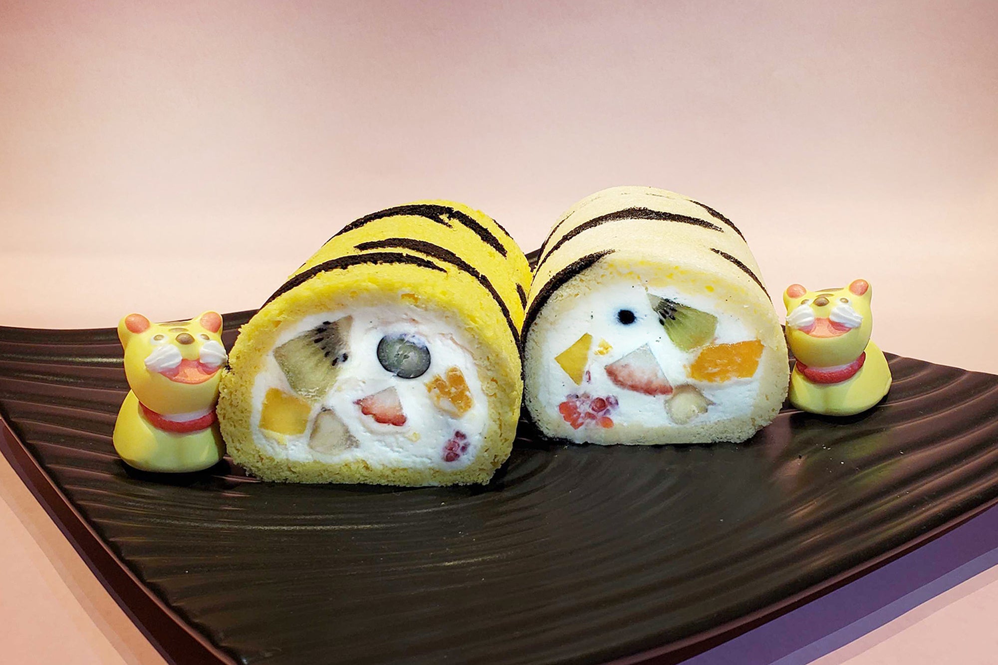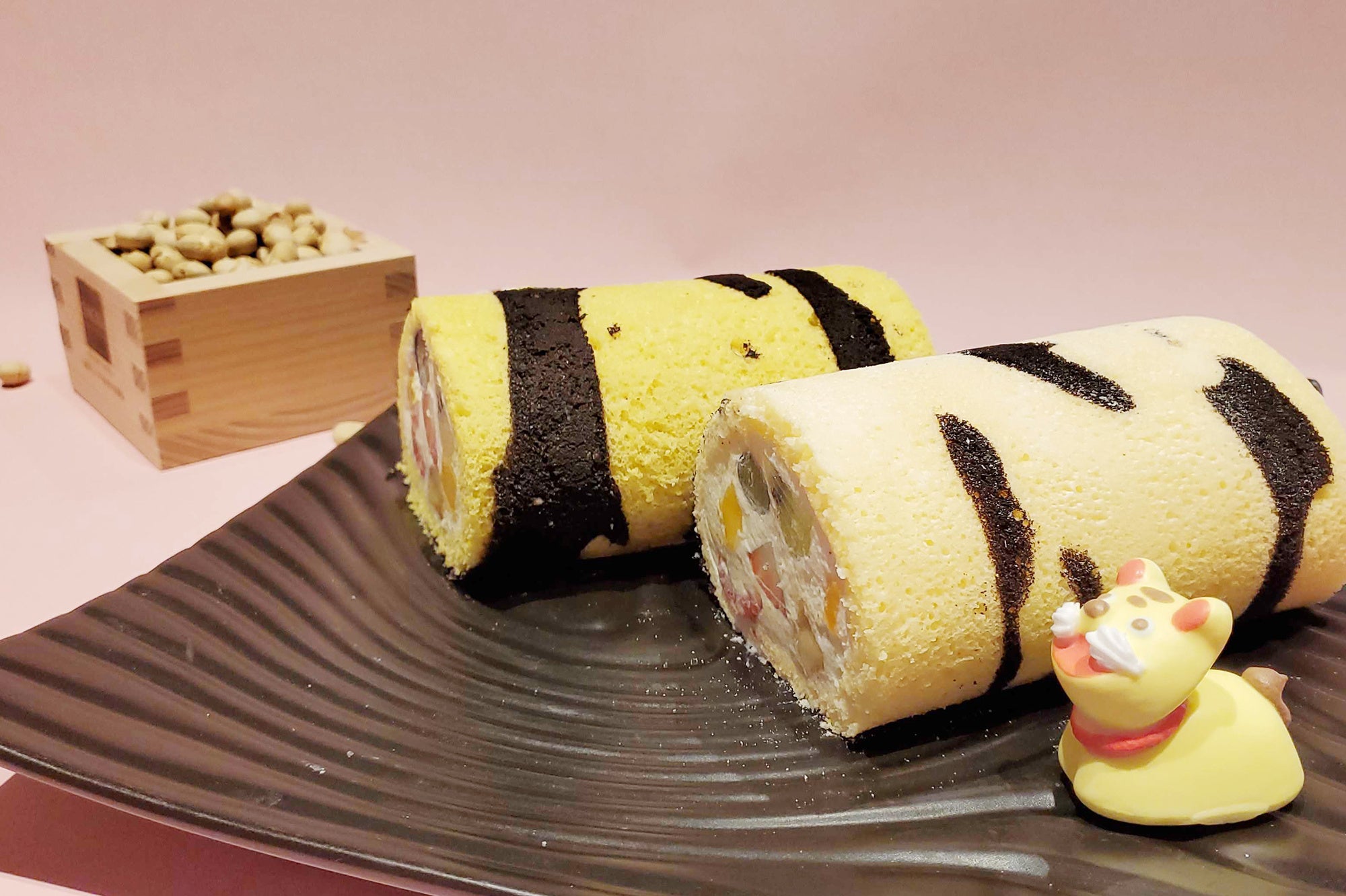 コロナ禍で今年の節分をおうちで過ごす方が増えることを考え、定番イベントを楽しんでいただきたいとパティシエの遊び心から生まれた「寅の恵方巻ロール」をご用意しました。黄色と白のスポンジには寅年にちなんでココアで作った寅柄をあしらい、七福神にちなんだ7種類のフレッシュフルーツを生クリームとカスタードクリームを合わせたクリームでロールケーキに仕上げました。イエロータイガーとホワイトタイガーの2匹(本)をセットでお持ち帰りいただきます。