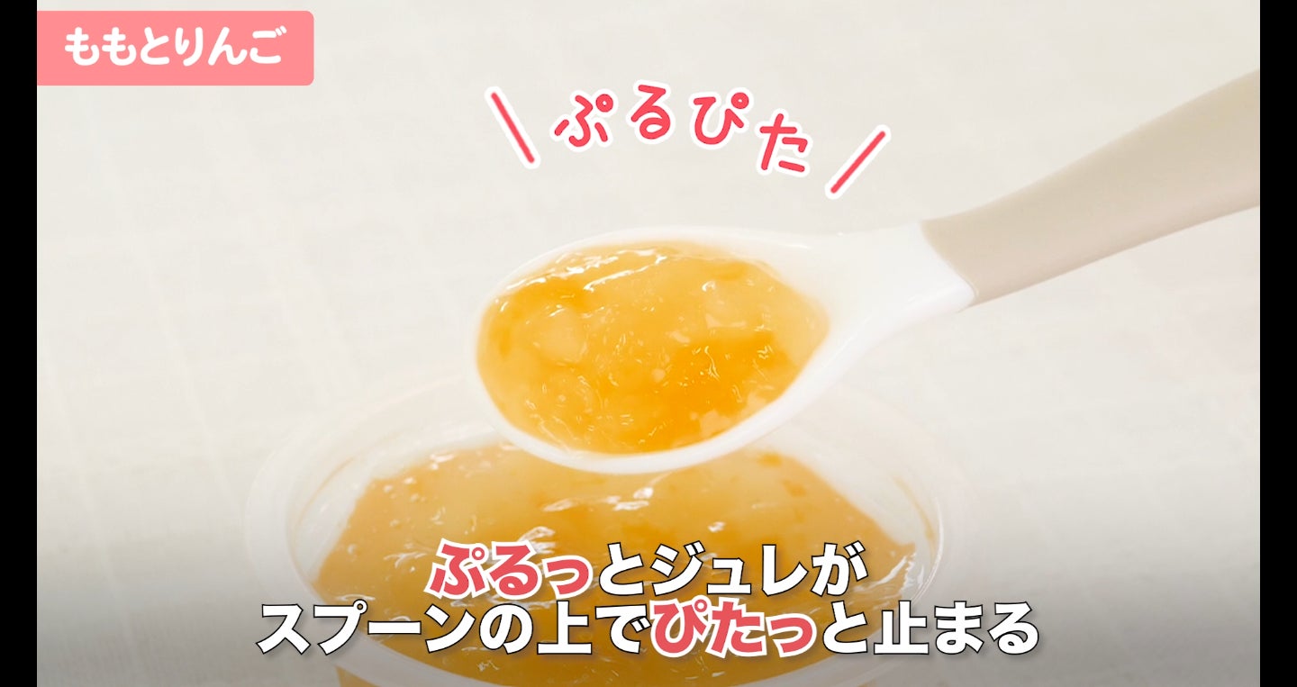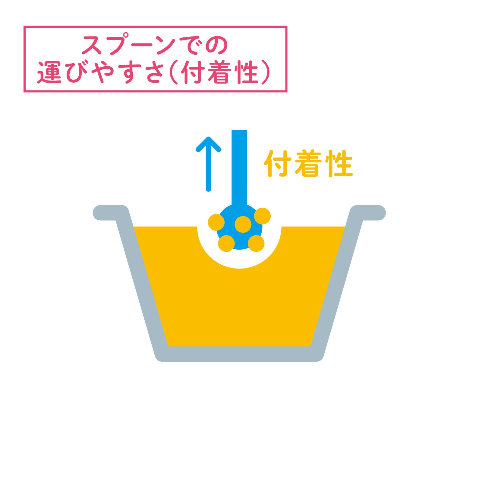 「スプーンがうまく使えず、かんしゃくを起こす」「スプーンが使えず、甘やかしと言われた」など、育児の中でも“スプーン食べ”に関する保護者の悩みは数多く聞かれます。本シリーズは、グループ会社のアヲハタ株式会社が持つゲル化の技術を活用し、“すくいやすく・こぼしにくく・飲み込みやすい”やわらかさに設計しています。スプーンの上で滑りにくいため、赤ちゃんの不安定な手つきでも、こぼさずに口に運ぶことができます。今回改良を行い、さらに“すくいやすく・こぼしにくい”物性になりました(【参考データ】参照)。