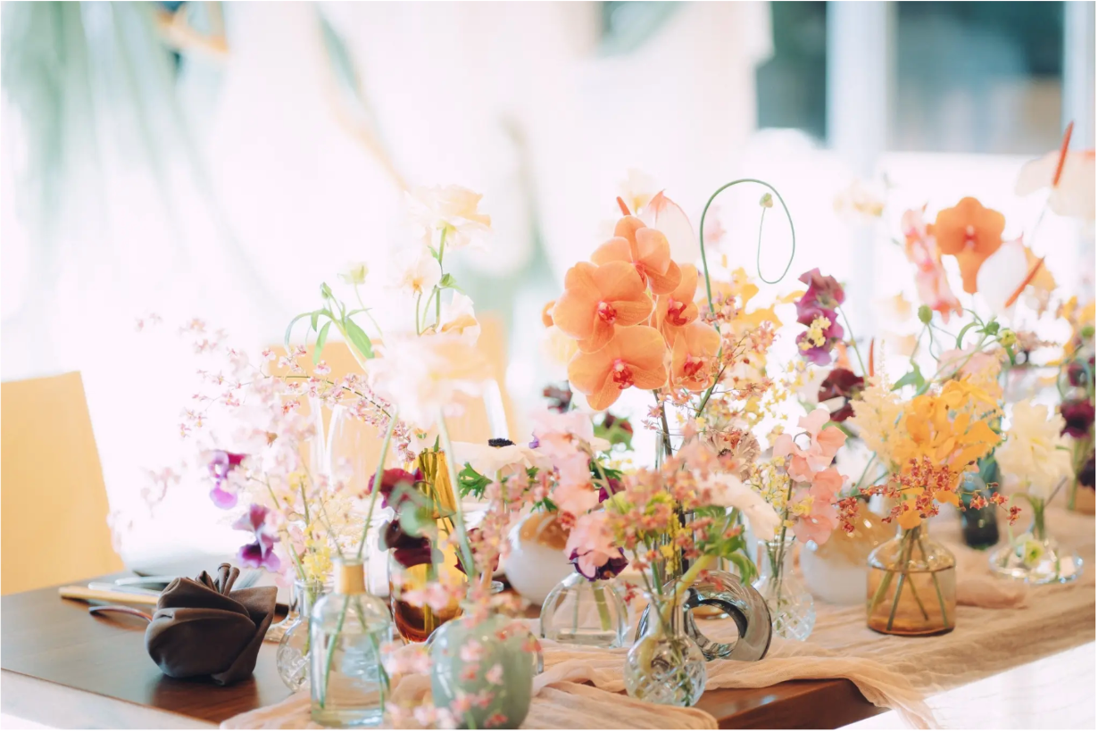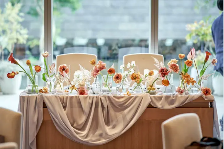 もう一つは「花材を一輪挿しでミニマルに配置する」スタイルです。近年、大きなまとまった装花よりも、多種多様な一輪挿しを活用してお花を散りばめるスタイルがよく見られます。お花に高さが出る上に、多彩な雰囲気や表情を楽しむことができます。さらに費用対効果も高いため、多くの花嫁さんが取り入れているようです。