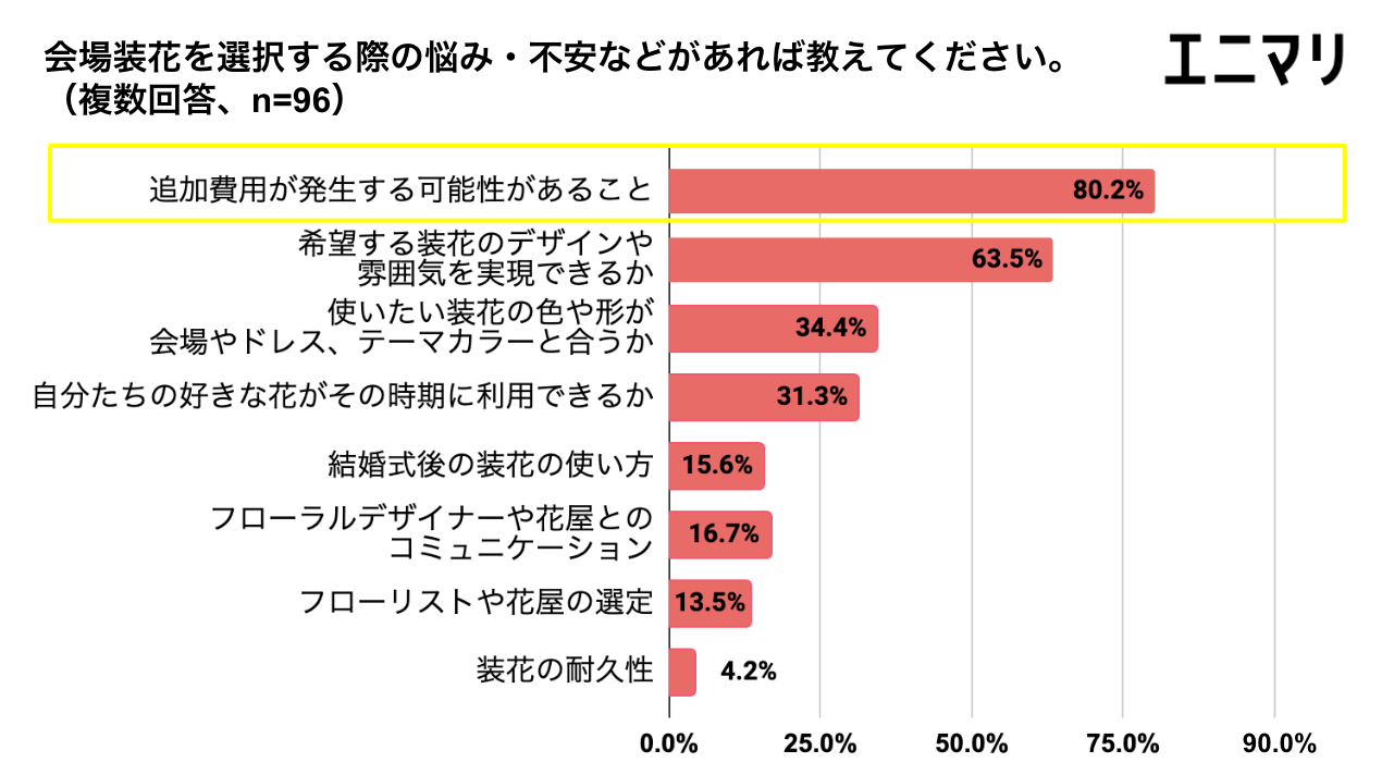 2. 会場装花を選択する際の悩みや不安は、「追加費用が発生する可能性があること」