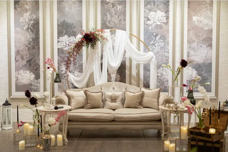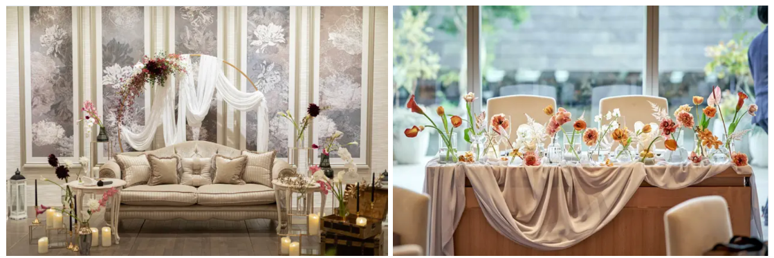 結婚式のカタチが多様化する中、装花や装飾のトレンドも常に進化しています。最近見られる装花のトレンドの一つは、「花材以外のアイテムで雰囲気やボリュームを出す」スタイルです。例えば、キャンドルを配置して雰囲気を作ったり、透け感のある布でドレープを作ったりすることで、花材以外でボリュームを持たせ、費用を抑えつつもトレンド感のある演出をする花嫁さんが多いようです。