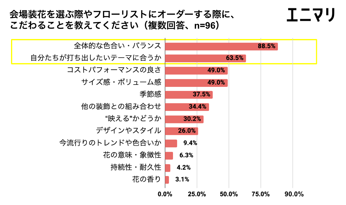 自分たちらしい結婚式を彩るアイテムとして、会場装花の重要性について聞いたところ、約9割のカップルが「重要」と回答しました。また、会場装花を選ぶ際やフローリストにオーダーする際にこだわるポイントとして、「全体的な色合い・バランス」「自分たちが打ち出したいテーマに合うか」が上位にならびました。会場装花はカップルが実現したい結婚式全体のコンセプトやテーマを反映する重要な要素であることがうかがえます。
