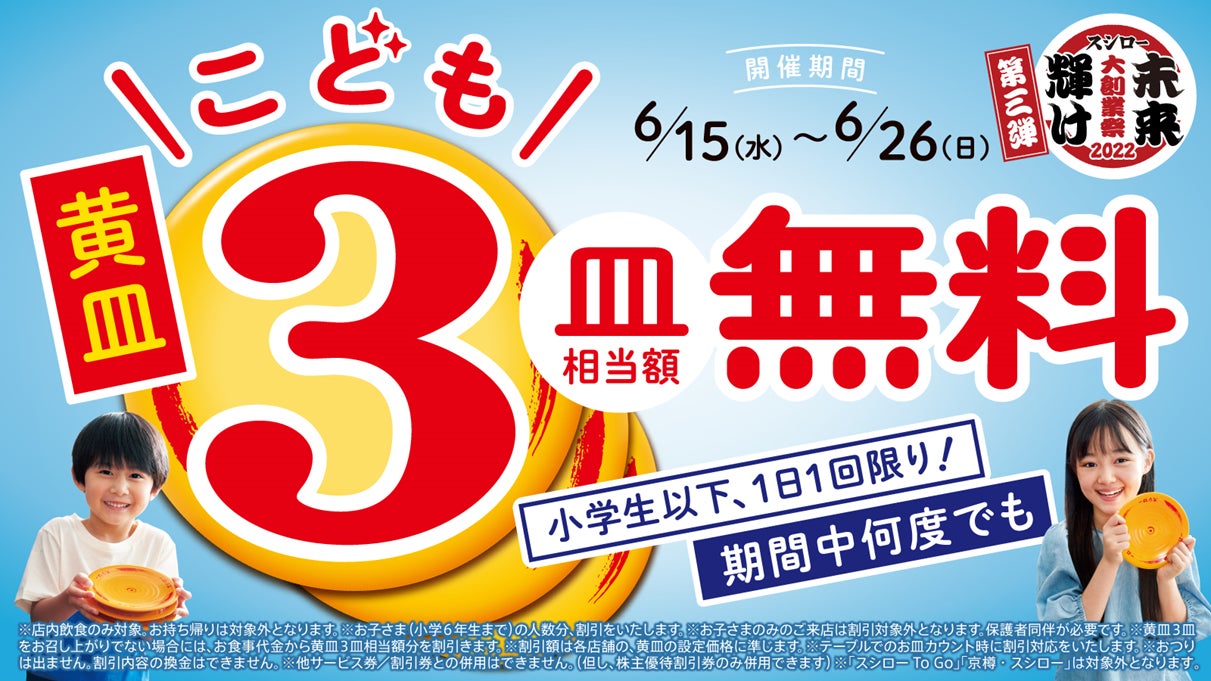 未来輝け『スシロー大創業祭』第三弾!テーマは“輝け、子ども達の笑顔。”これからの未来を担う子ども達に“うまいすしを、腹一杯。”小学生以下が対象『こども黄皿3皿相当額無料』(※1)を実施!