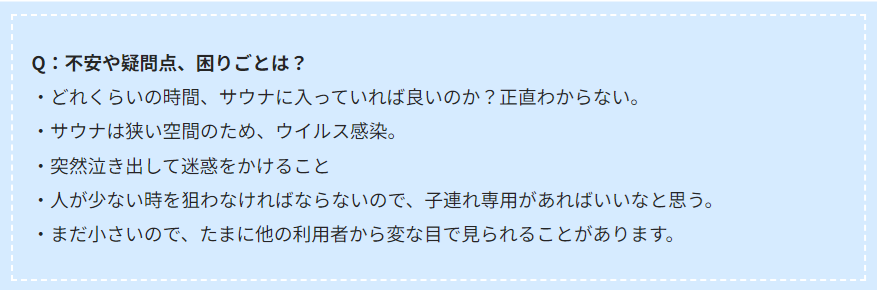 赤ちゃんを入れる際の困りごととして多く見られたのが「他人の目」でした。赤ちゃんをサウナに入れる、ということが日本ではスタンダードではないため他の利用客から驚きの目で見られることもしばしば。それだけでなく、突然泣き出してしまい迷惑をかけてしまうということも。その他、ウイルス感染や長時間入っていられないなどの声も見られました。