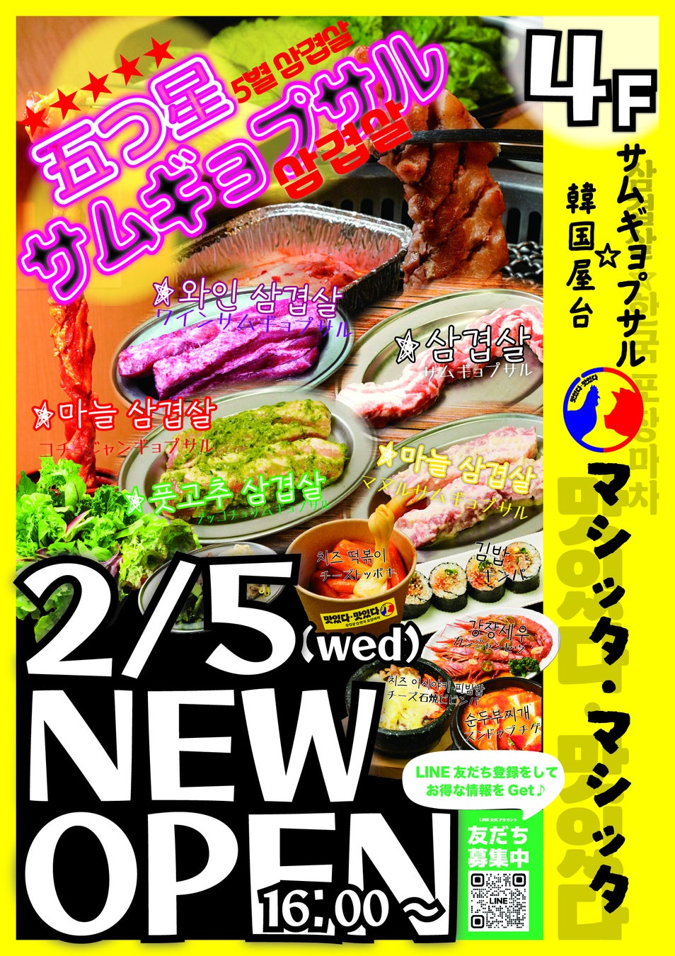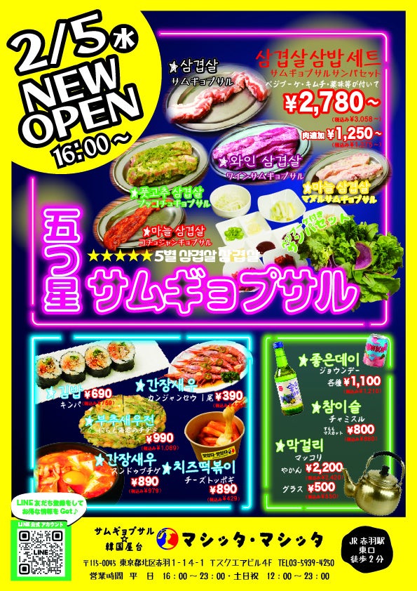 株式会株式会社SANKO MARKETING FOODS(本社︓東京都中央区新川⼀丁⽬10番14号、代表取締役社⻑︓⻑澤 成博、以下「当社」)は、本日2月5日(水)よりJR赤羽駅前に、新業態となるサムギョプサル専門店『サムギョプサル★韓国屋台 マシッタ・マシッタ』をオープンいたしました。口に入れた途端、思わず「マシッタ!マシッタ!」(ウマい!ウマい!を意味する韓国語)と、言いたくなってしまうような肉厚のサムギョプサル各種をはじめ、ケランチム、ヤンニョムチキンなど、本場ソウルの屋台を彷彿とするメニュー、さらにサンチュ、エゴマの葉が山盛りのベジブーケなど、ヘルシーメニューも取り揃えました。ぜひ、活気あふれる韓国屋台の風情の中、絶品料理に舌鼓を打つひとときをお楽しみください。