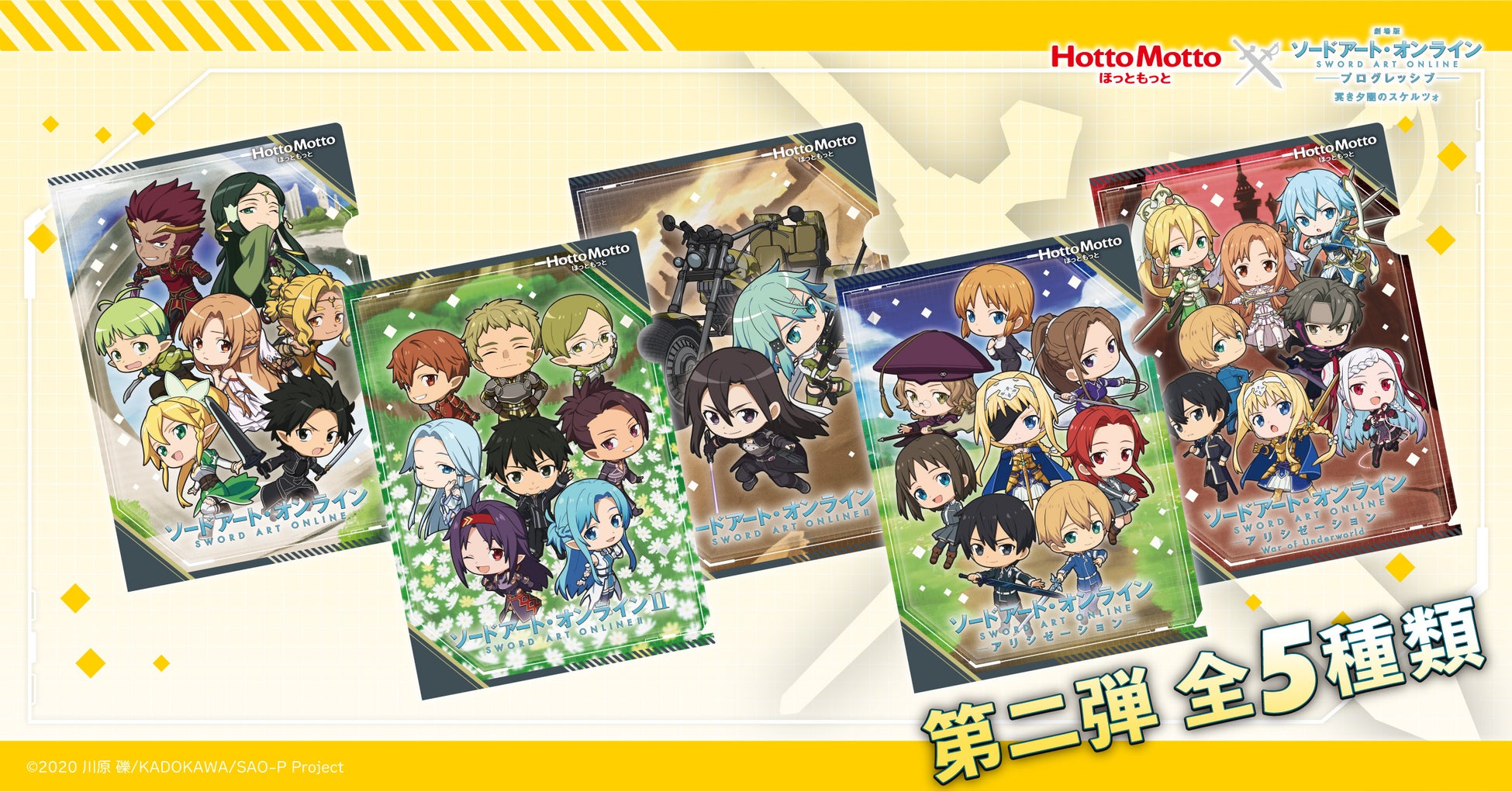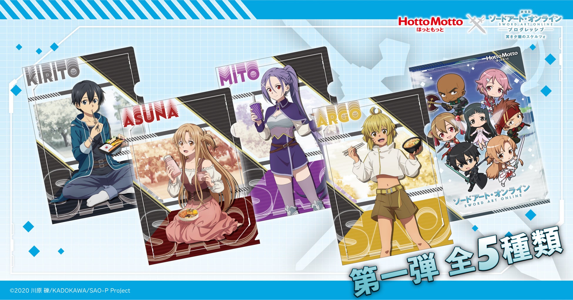 クリアファイルは、第一弾・第二弾それぞれ5種類あり、第一弾は10月22日(土)から公開の「劇場版 ソードアート・オンライン-プログレッシブ-冥き夕闇のスケルツォ」とコラボした描きおろしイラストデザインのほか、「ソードアート・オンライン アインクラッド篇」に登場するキャラクターがミニキャラとなって登場いたします。また、第二弾には「ソードアート・オンライン アニメ10周年記念」として、歴代シリーズに登場したキャラクターがミニキャラとなって集合したデザインラインナップとなっております。
