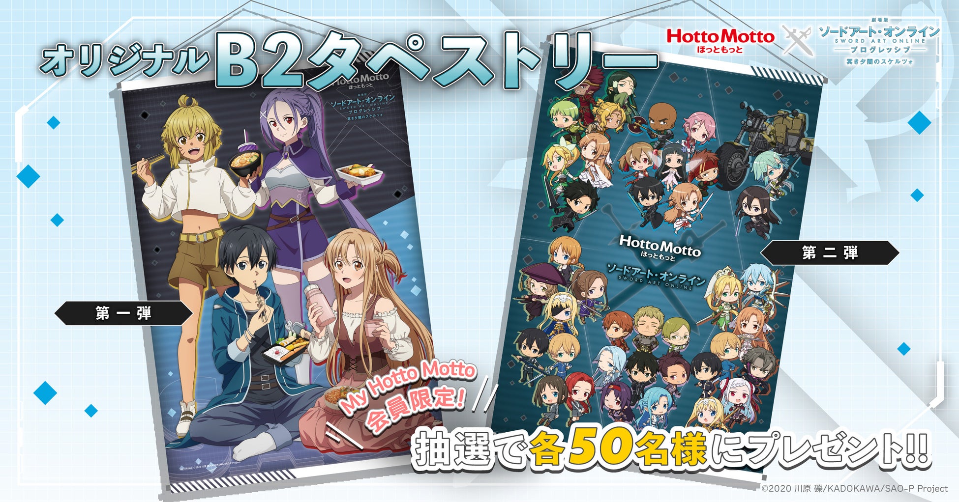 第一弾は「劇場版 ソードアート・オンライン-プログレッシブ-冥き夕闇のスケルツォ」の描きおろしキャラクターが登場いたします。第二弾はソードアート・オンライン歴代シリーズを彩ってきた、ミニキャラが1枚のタペストリーに集合したデザインとなっております。