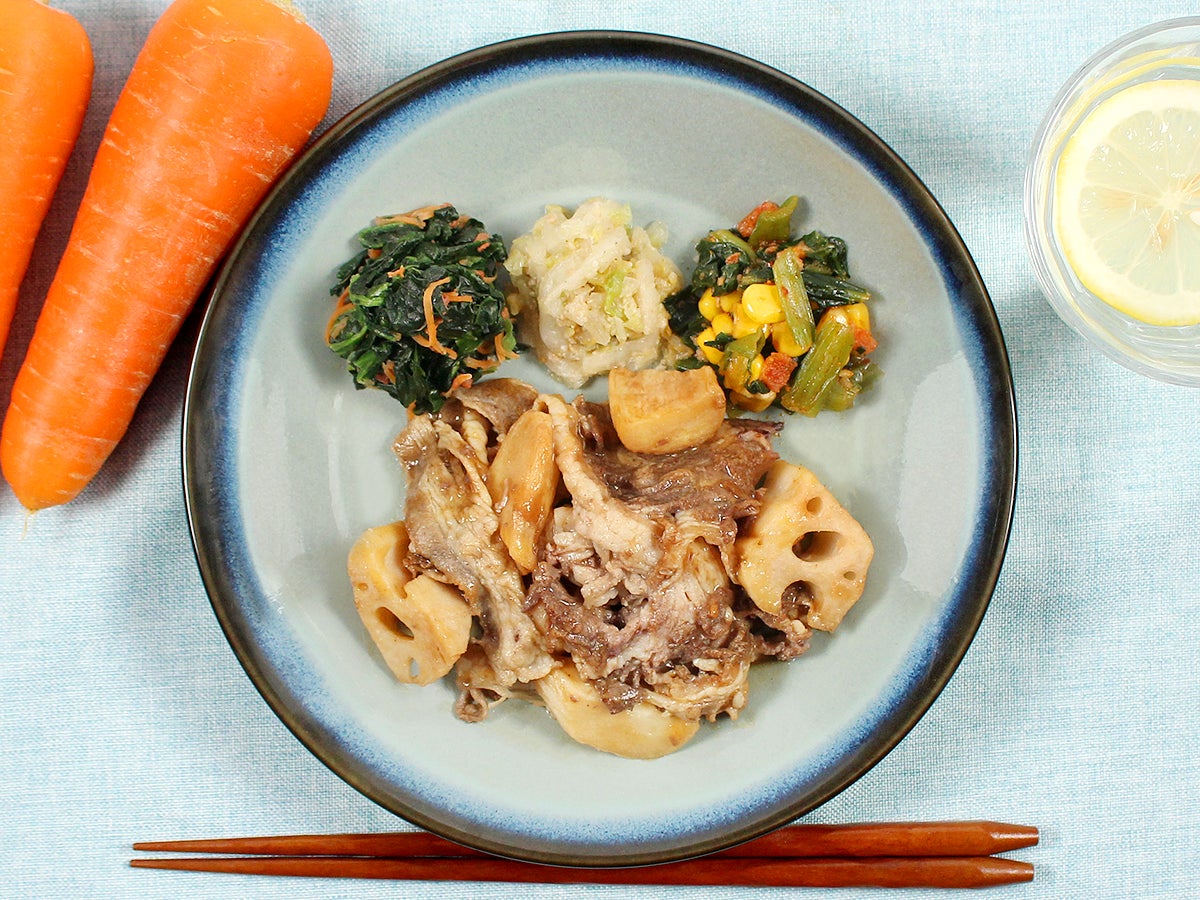 副菜は、ほうれん草・人参・細かく刻んだ大豆ミンチの入ったほうれん草サラダ、白菜のごまだれ、コーン入りの小松菜の辛味あえです。