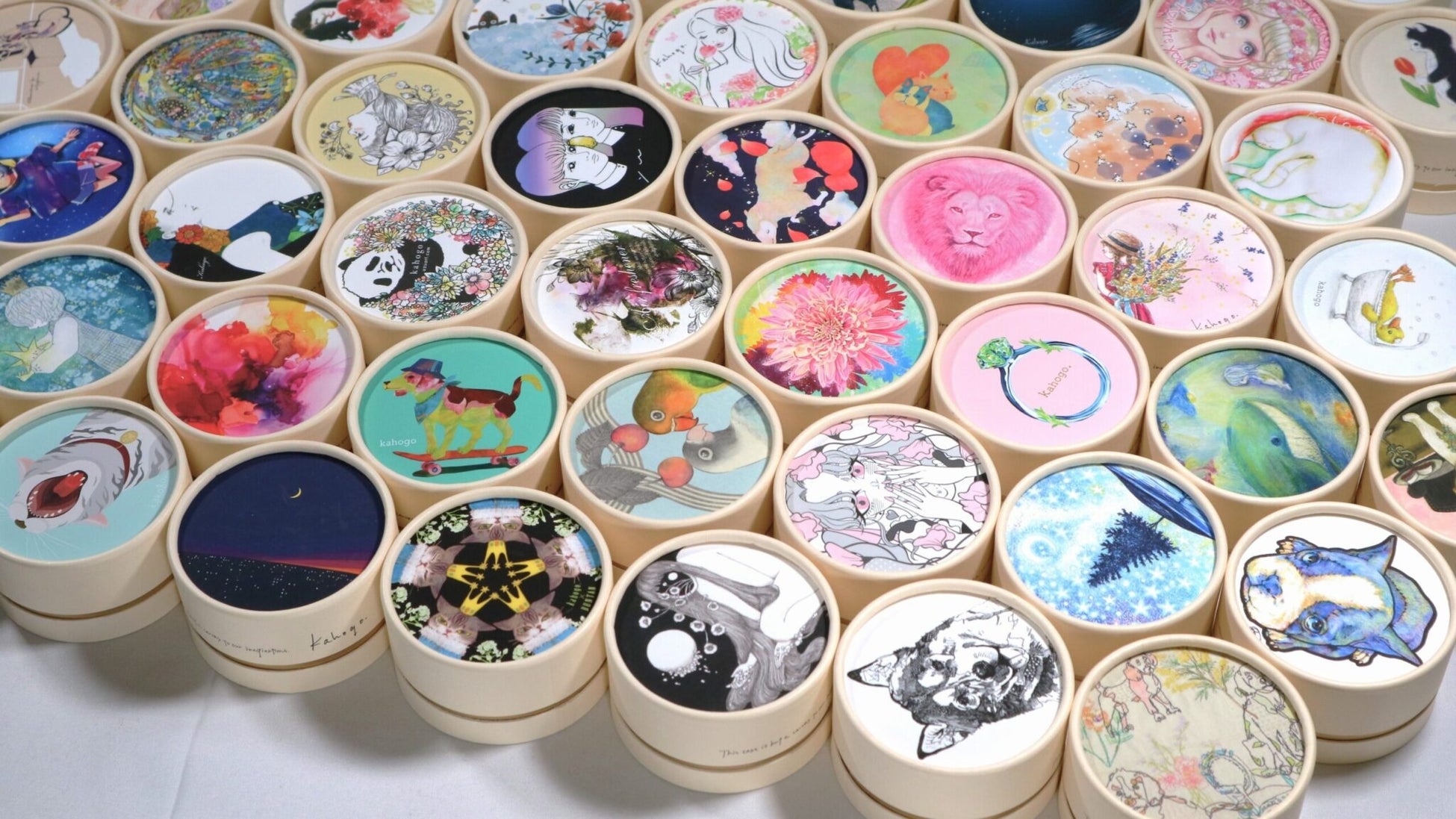 kahogoは直径7cmの石鹸パッケージをキャンバスに見立て、クリエイターと見る人を繋ぐプロジェクト。毎年アートコンペを開催し、刺繍作家、絵本作家、写真家、書道家など様々なジャンルの作家が採用されています。テーマにとらわれず様々な想いや個性を表現したアートはパッケージから取り出し、額装ができる仕掛けに。眺めたい、贈りたい、誰かに教えたい…そんな560作品が様々な地を旅しています。