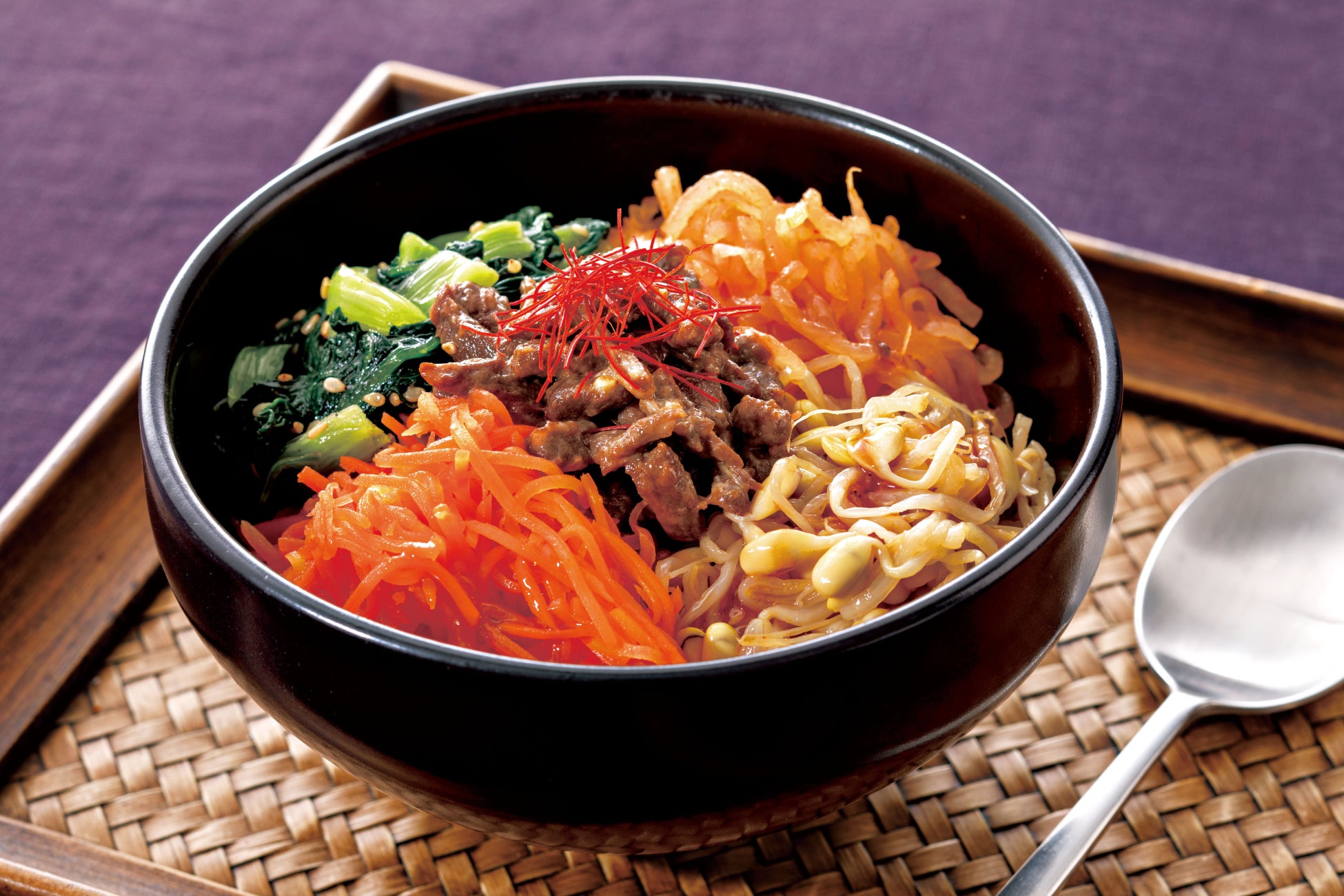 ピリリと辛い人参、大根、小松菜、もやしのナムルに、牛肉をのせビビンバ丼。お好みでピリ辛のコチュジャンダレをかけてお召し上がりください。
