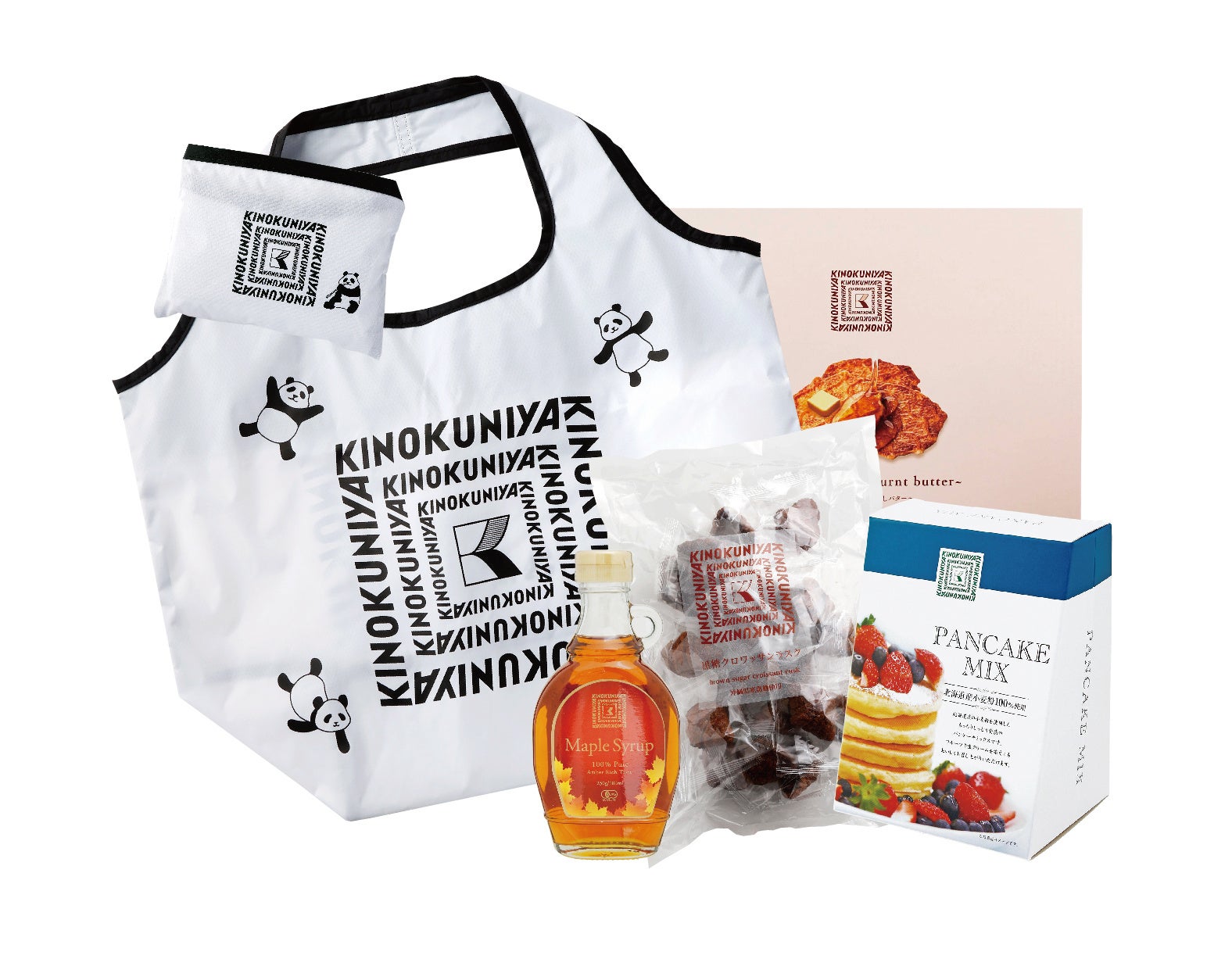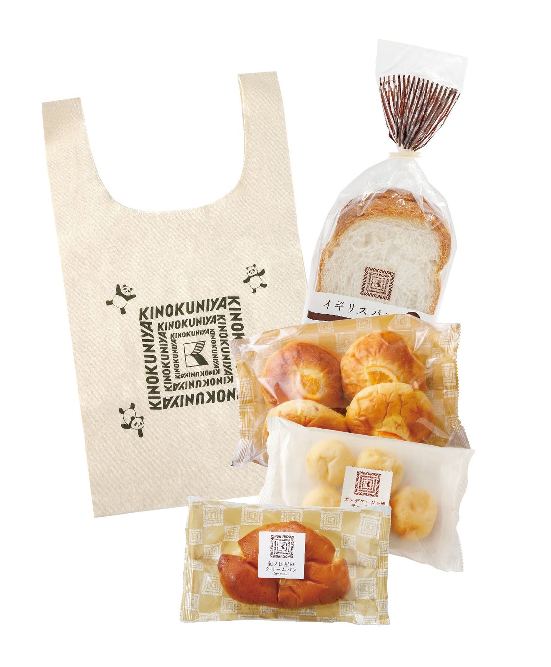 イギリスパン(3枚入)、オレンジロール(4個入)、ポンデケージョ風チーズパン(5個入)、紀ノ国屋のクリームパン、パンダコットンバッグ(約縦54×横30×マチ9cm) 各1個