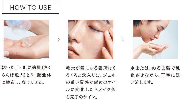 ヒマワリ種子油をベースにした植物オイルを豊富に含んだ弾力のあるジェルがメイク汚れなどを包み込みながら絡めとり、 オイルへ変化し浮かせてリリースすることで、毛穴の中のミクロな汚れまでスッキリ落とします。