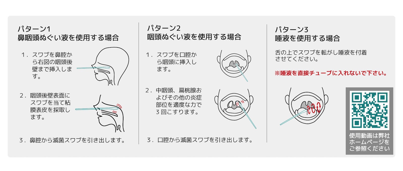 口咽頭、鼻咽頭、唾液のいずれかの部位から検体を採取します。