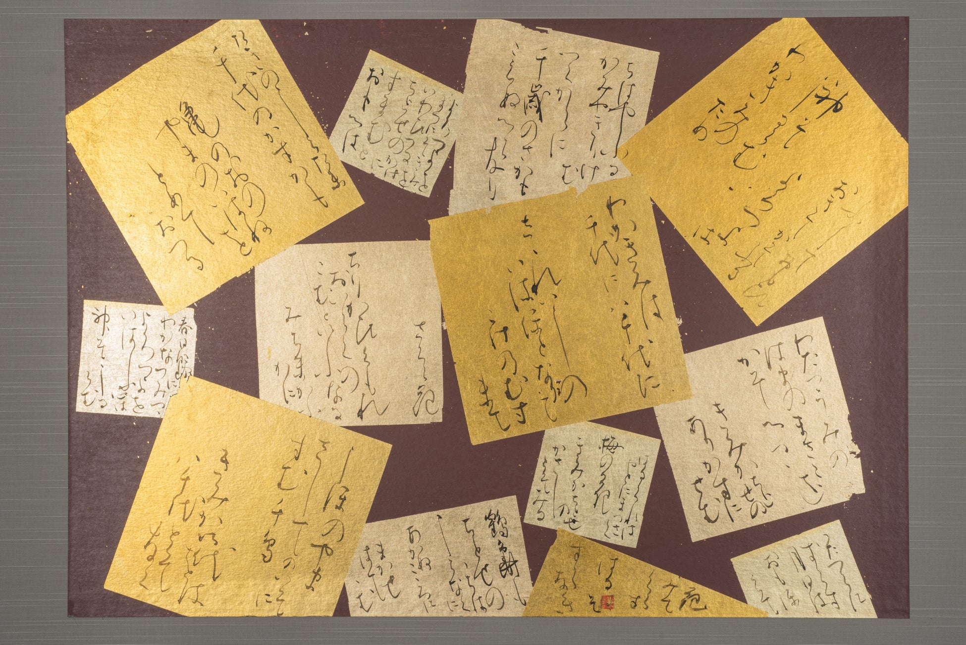 現代人も読むことのできる平仮名で古典をつづった新作16点を展示