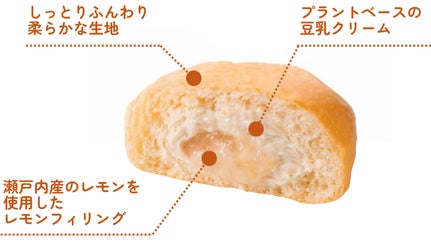 ふんわりしっとり柔らかな生地の中に、オーツミルクをベースに炊き上げたカスタードに大豆ホイップを合わせたプラントベースの豆乳クリームと、瀬戸内産のレモンを使用したレモンフィリングを2層仕立てで入れました。