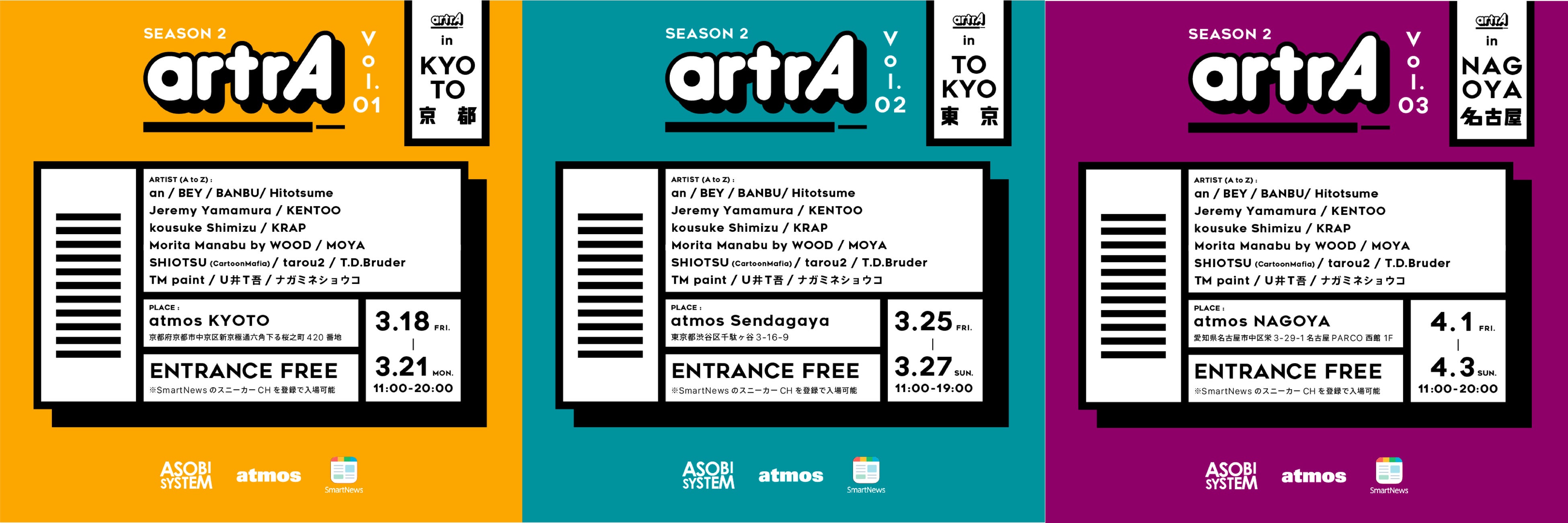 SEASON 2も「ASOBISYSTEM」主催のもと、コンテンツパートナーとして、東京のスニーカーシーンを世界に発信する「atmos」、そして新たにニュースアプリ「SmartNews」を迎え、東京、名古屋、京都でイベントを⼀緒に盛り上げて⾏きます。