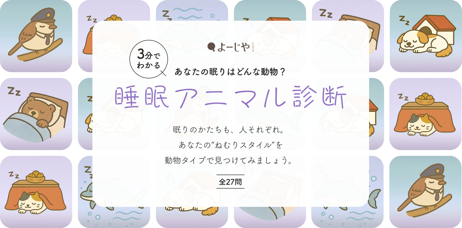 株式会社よーじや(京都府京都市下京区、代表取締役・國枝昂)が運営する、京都発のライフスタイルブランド「よーじや」は、「春の睡眠の日(3月18日)」に合わせて、2026年3 月 18 日(水)~3 月 23 日(月)の期間、ビーズクッションやシルクの枕カバーなどが当たるXのフォロー&リポストキャンペーンを実施いたします。ナイトルーティンに香りをプラスする「ねむり」シリーズ発売後より公開中の「睡眠アニマル診断」の結果を投稿することで当選確率アップ。この機会に、ナイトルーティンや睡眠習慣を見直してみては。