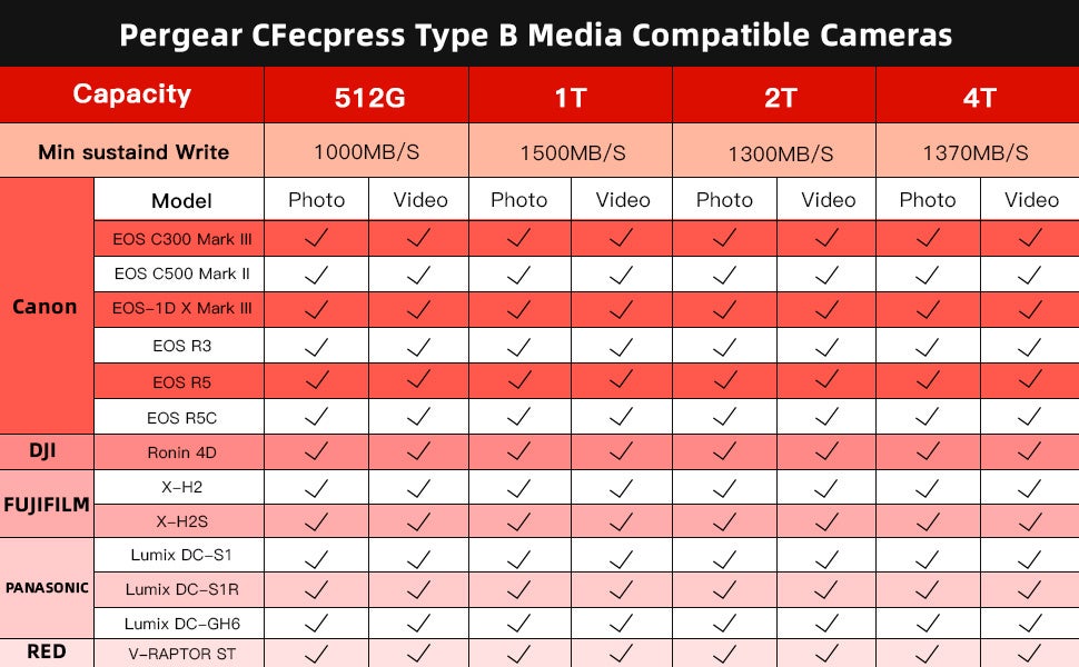 バージョンアップされたPergear CFexpress TypeBメモリーカードには高速連写、バッファクリア、8K60P N-RAWのビデオ録画がサポートされ、前バージョンより、読み出し速度も書込速度も飛躍的に向上させます。