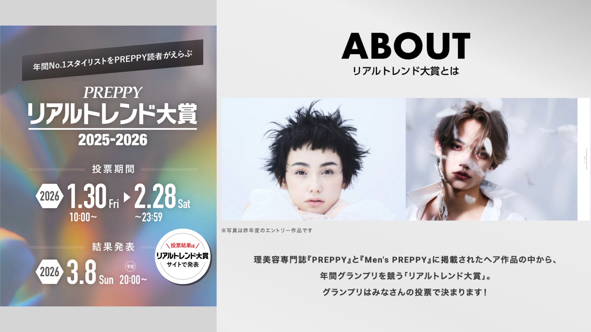 理美容専門誌『PREPPY』『Men’s PREPPY』の読者投票(理美容師・美容学生)で選ばれたノミニーの中から年間グランプリを決める「PREPPYリアルトレンド大賞2025-2026」投票開始!