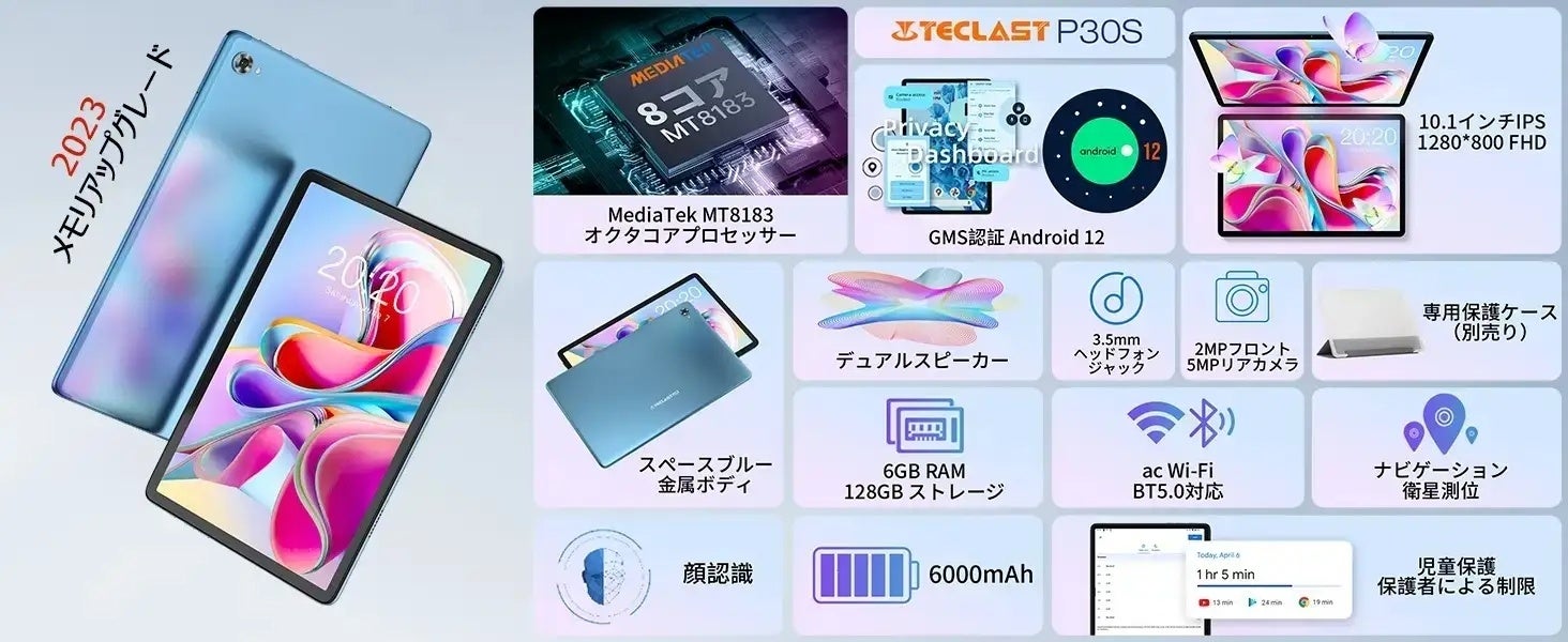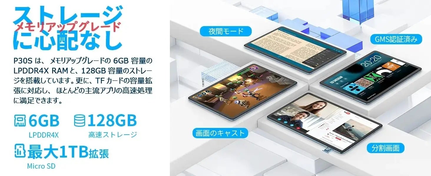 10インチ / Android 12 / 6GB RAM+128GB ROM+1TB拡張 / WIFIモデル / 3.5mmヘッドホン / GPS機能サポート / 技適マーク取得