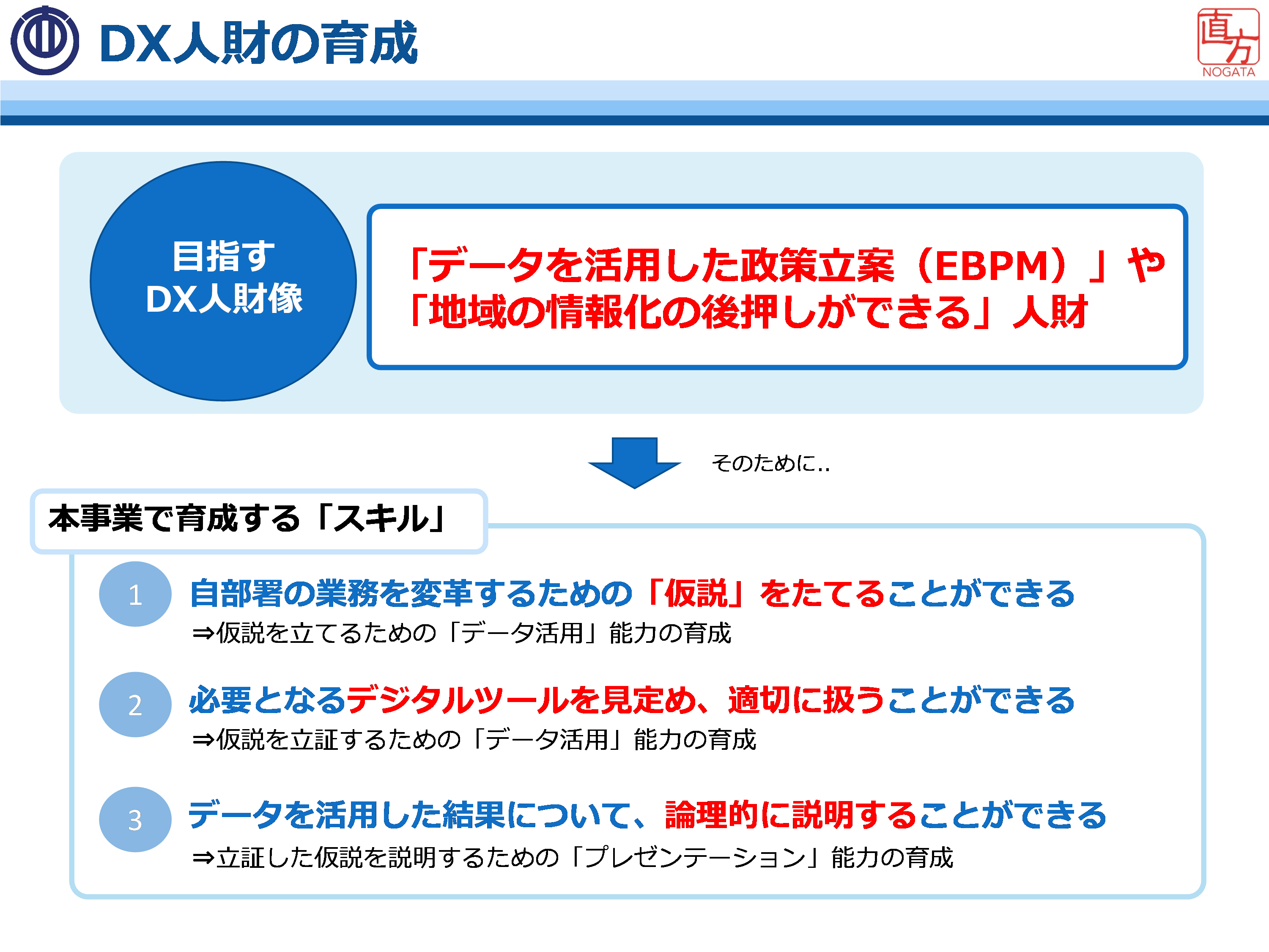 直方市では、今年度、㈱グルーヴノーツと連携して、各課から選出された職員を対象とした「DX人財育成事業」を実施し、データを活用した施策の立案や業務変革を牽引することができる人財の育成に取り組んでいます。