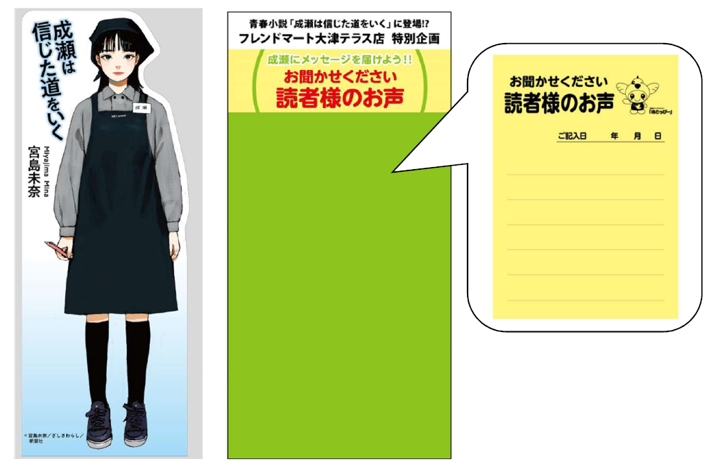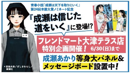 本屋大賞ノミネートを記念して、4月1日(月)~6月30日(日)の間、作中に登場する店舗のモデルとなったフレンドマート大津テラス店において『成瀬は信じた道をいく』の特別企画として、平和堂の制服姿の成瀬あかりの等身大パネルや、スペシャルメッセージボードを設置します。また、期間中は、滋賀県主催の大津市内小説ゆかりの地をめぐる「この春を成瀬に捧げるスタンプラリー」のラリースポットとして参加します。ぜひ、『成瀬は信じた道をいく』の世界をお楽しみください。