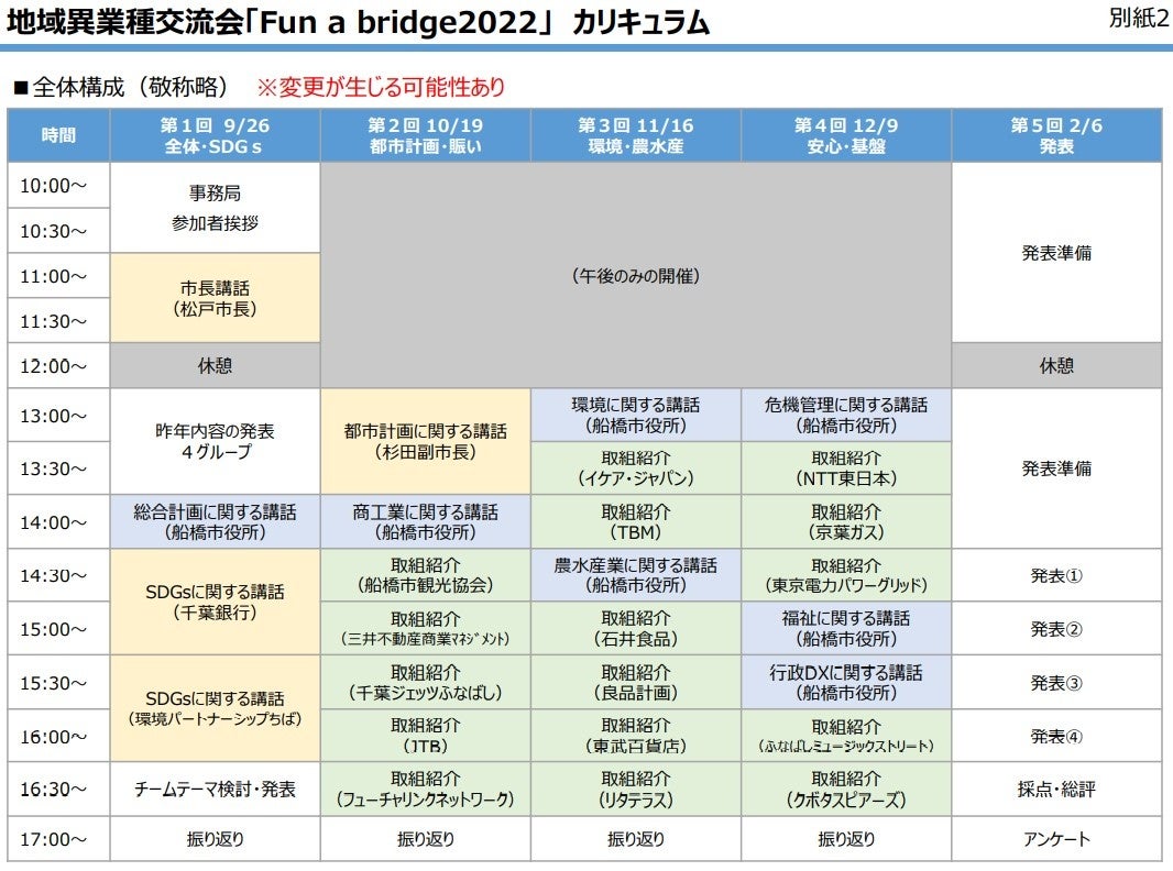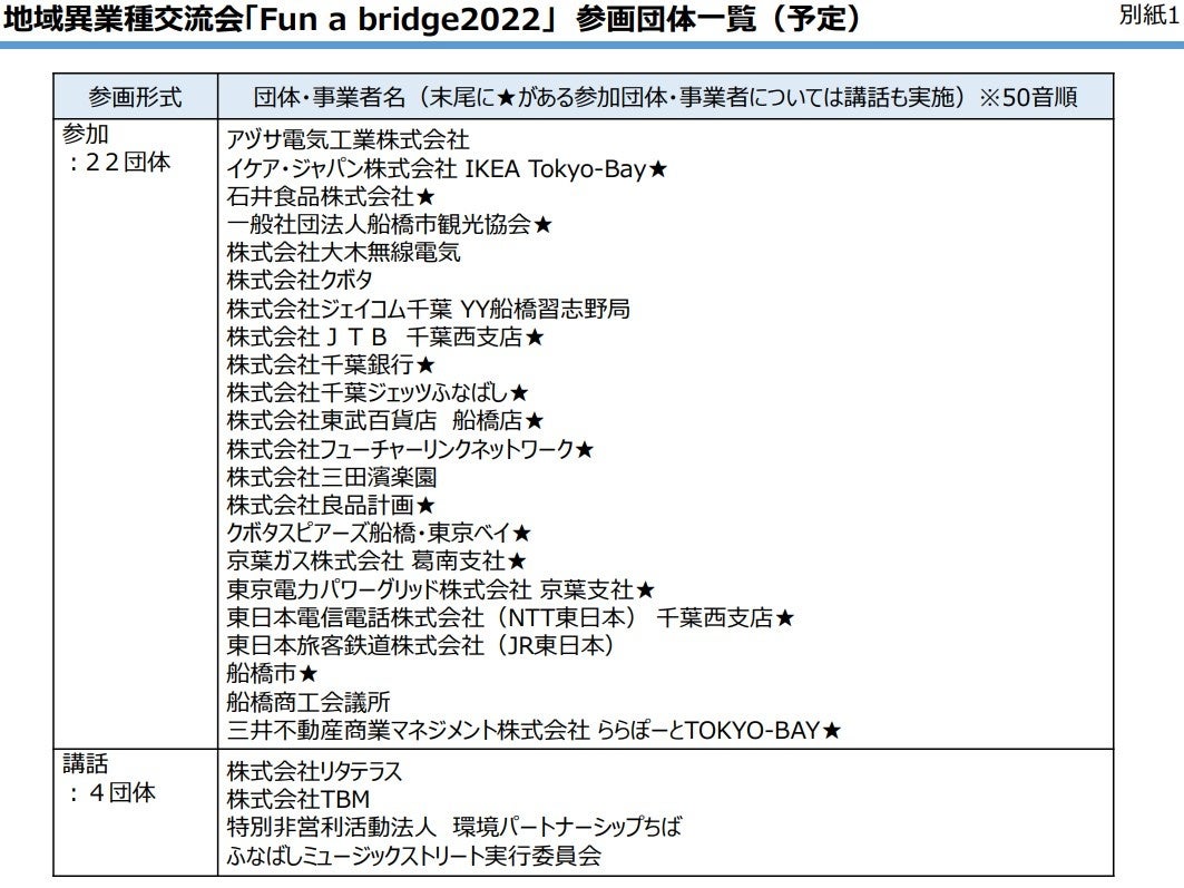 船橋に拠点を設ける事業者・団体など計22団体※は、「共創」による船橋のさらなる活性化と、船橋の持続的な発展を支える「次世代」の育成を目的に、22団体合同の異業種交流会「Fun a bridge2022」を開催します(後援:船橋市・船橋商工会議所)。なお、詳細につきましては、以下の通りです。