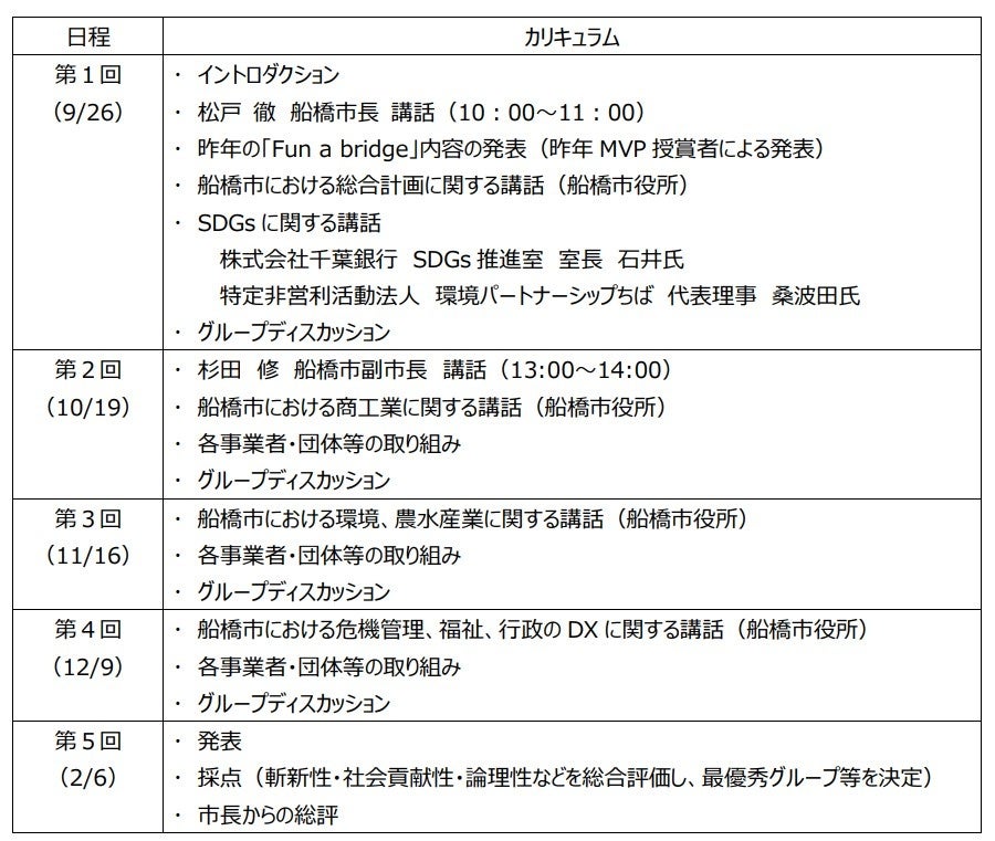 あわせて、参加者同士がともに未来の船橋をつくる仲間として「船橋愛」を育み、将来にわたって有機的に結びつくことで、船橋の持続的な発展を支える「次世代」、および「次世代」のリーダーとなることを目指します。
