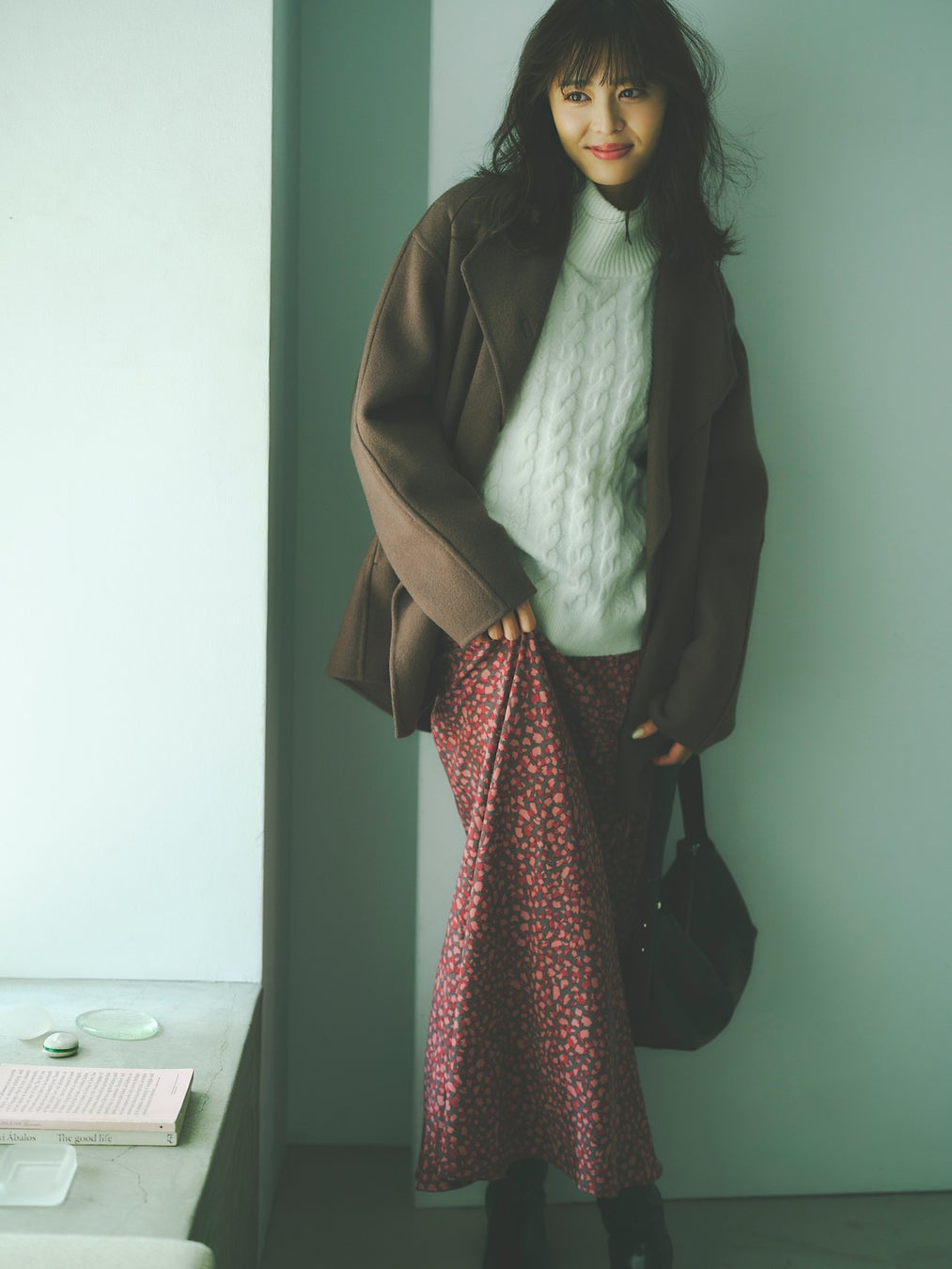 COAT_¥48,400 KNIT_¥19,800 SKIRT_¥20,900 PIERCE_¥5,280 BAG_¥15,400