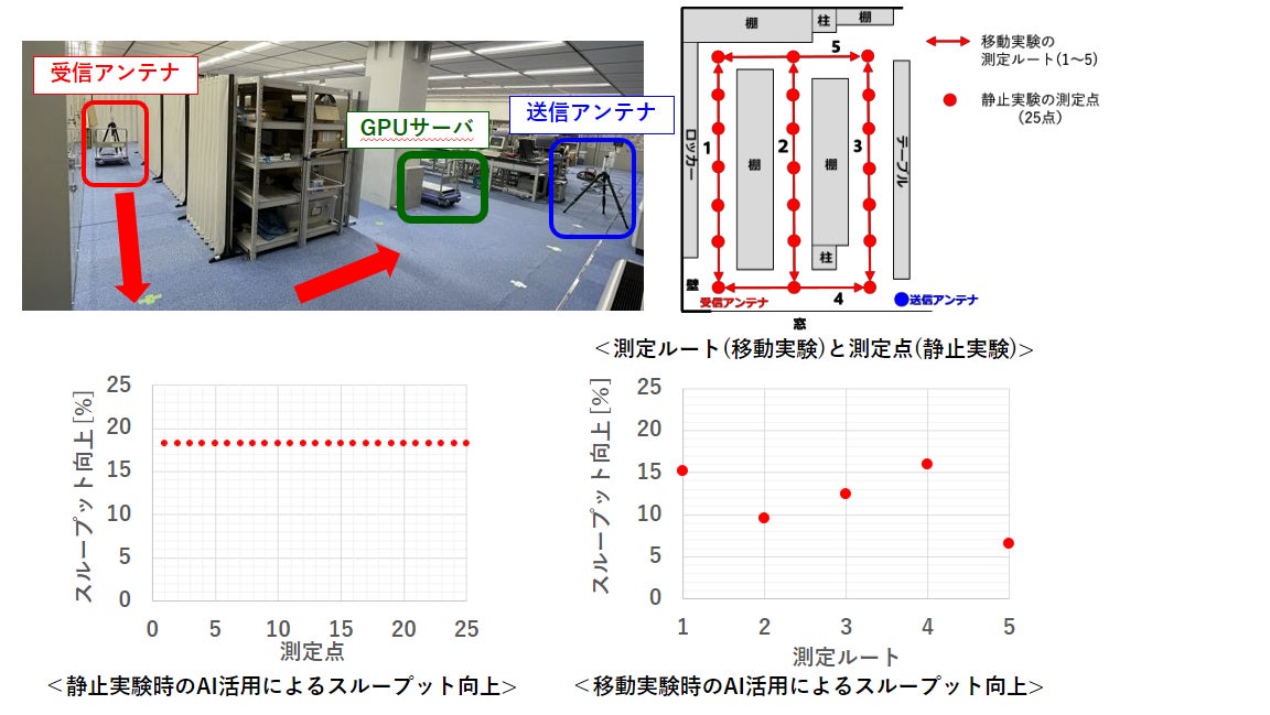 今回、NTT横須賀研究開発センタで実施した実証実験では、実験室(7×13m)において、電波免許を取得して実際に電波を飛ばしてスループット特性を測定しました(図1)。具体的には、GPUサーバにAIを活用した送受信のベースバンド処理をソフトウェアで実現し、市販ソフトウェア無線(SDR)用ハードウェア※7を介して4.8GHz帯の無線周波数で実験を実施しました。ベースとなる無線通信方式は5G NR (New Radio)※8を用い、受信アンテナを台車に載せ、その台車を移動させて測定を実施しました。AIを用いない従来の方式と比較した結果、スループット特性が6~16%向上することが確認できました。また、移動ルートの25点において静止して実験を行った時も18%の向上を確認しました。これにより、AIを活用した変復調技術により、移動環境、静止環境とも通信性能が向上することを示すことができました。今後は、ユースケースを踏まえて、より複雑な屋内外環境において実証実験を進め、AIを活用した変復調技術の移動通信への適用領域を明らかにするともに、その拡大に必要な技術検証を行う予定です。