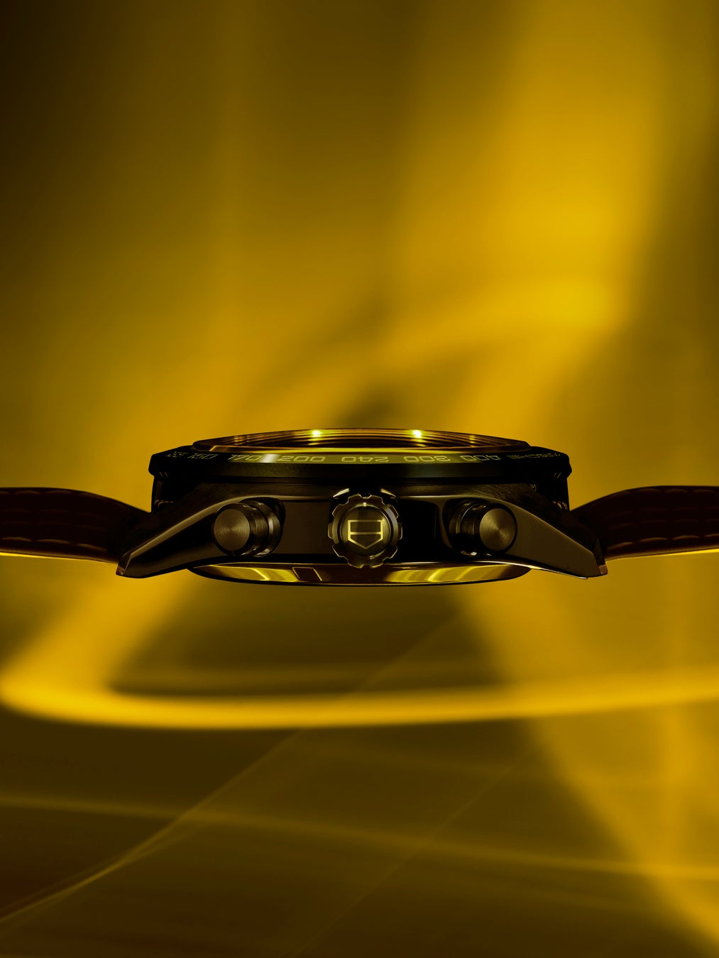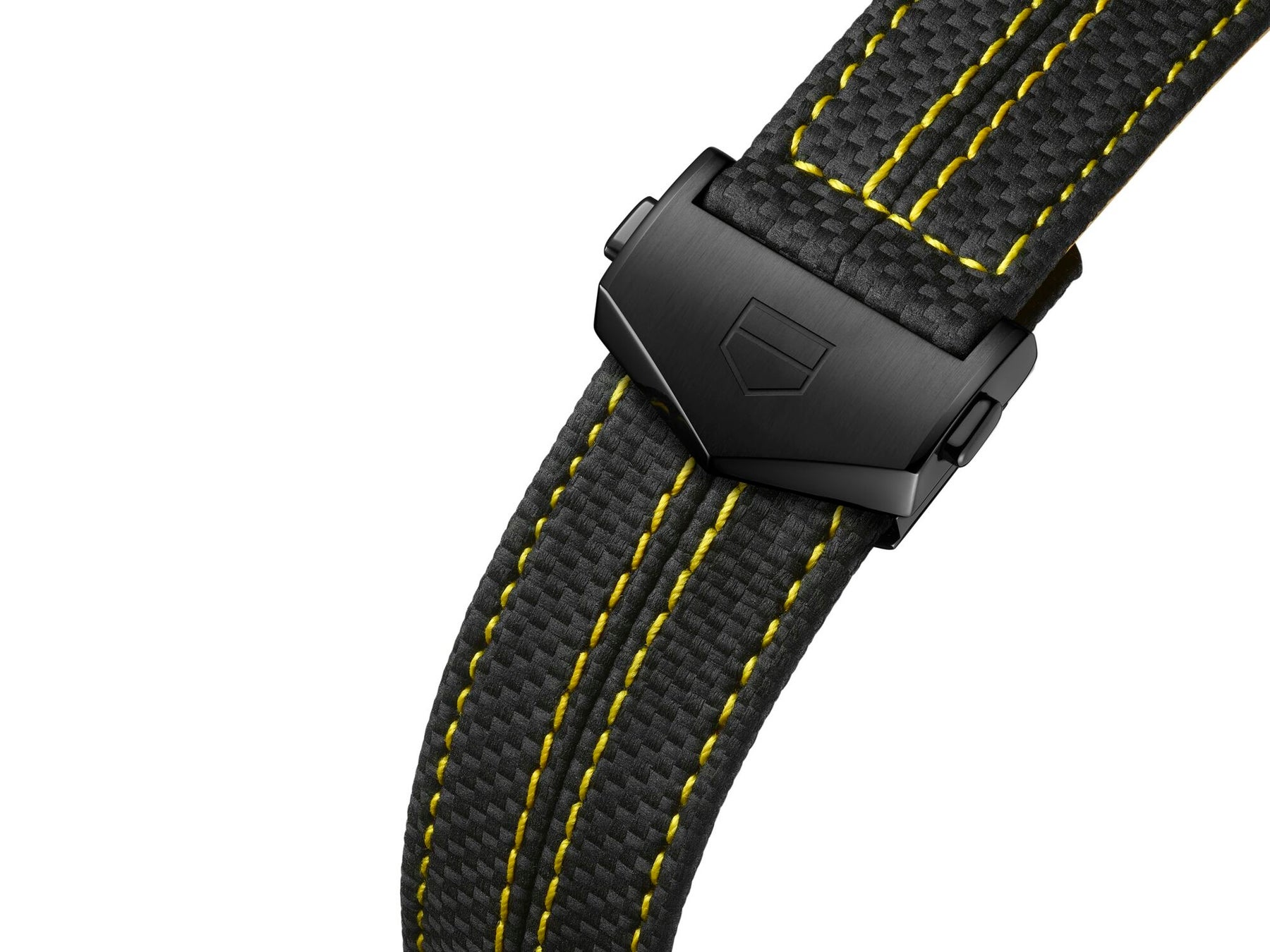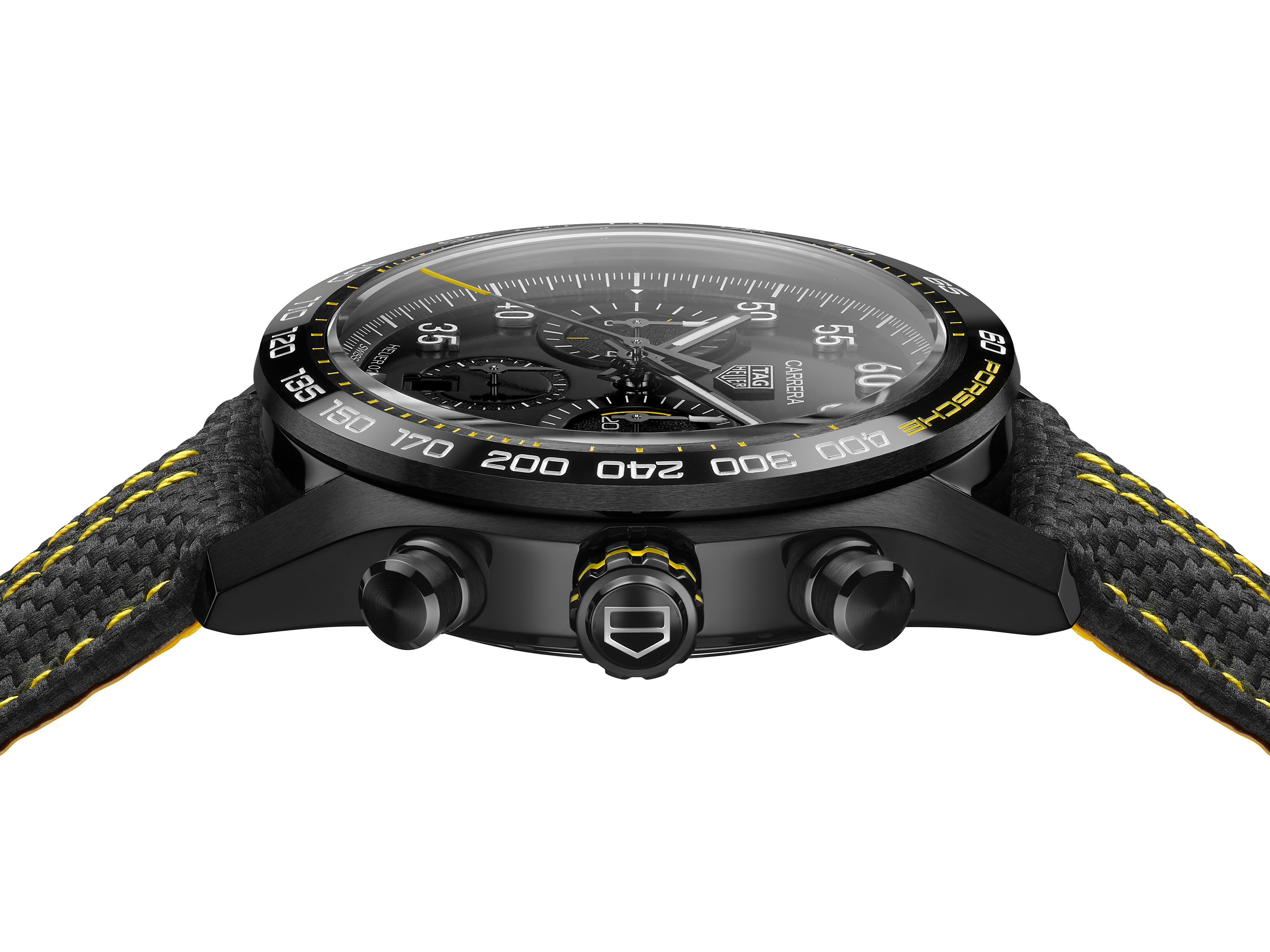 このリミテッドエディションの別のキーカラーはブラック。コントラストの効果でイエローの明るさを強調しています。このタイムピースにスポーティ・シックのタッチをもたらすため、タグ・ホイヤーとポルシェのデザイナーは、さまざまなテクスチャーのブラックを組み合わせました。