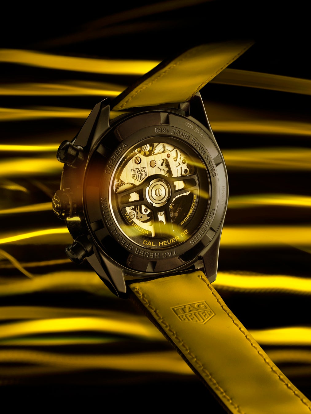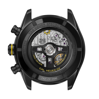 2021年モデルから受け継いだもうひとつの要素に、ポルシェの有名なハンドルへのオマージュとして新しくデザインされたローターがあります。 “Porsche” 、“TAG Heuer”と記されたシースルーケースバックからはっきりと見て取れ、そのブラックとイエローのカラーのタッチが、ウォッチのデザインに完璧なまでの調和を生み出しています。