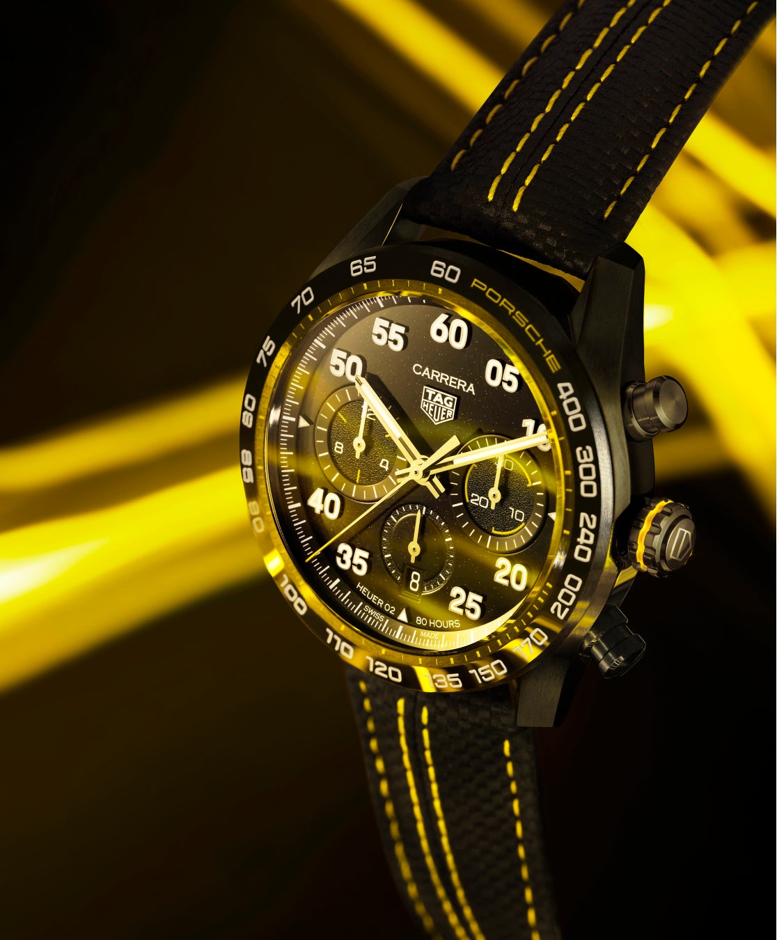 デザインにおいては、タグ・ホイヤー カレラ スポーツ クロノグラフのスポーティな側面が、ポルシェらしい審美性によってさらに高められています。イエローカラーは、このタイムピースのさまざまな要素に採用されていますが、この色はポルシェのレーシングカー用のイエローであり、このブランドの最もスポーティな車種だけに限られて使われている色です。このイエローは、ベゼルにあしらわれたポルシェのロゴ、リューズ、そしてダイヤルに細やかに施されたグラフィックディテール、および秒針に見ることができます。この色はスーパールミノバの蛍光色にも含まれており、暗闇で黄色くくっきりと浮かび上がります。