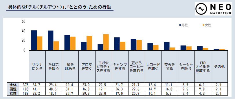 ■「チル(チルアウト)」・「ととのう」ための行動。男性は「サウナ」、女性は「ヨガやピラティス」が第1位